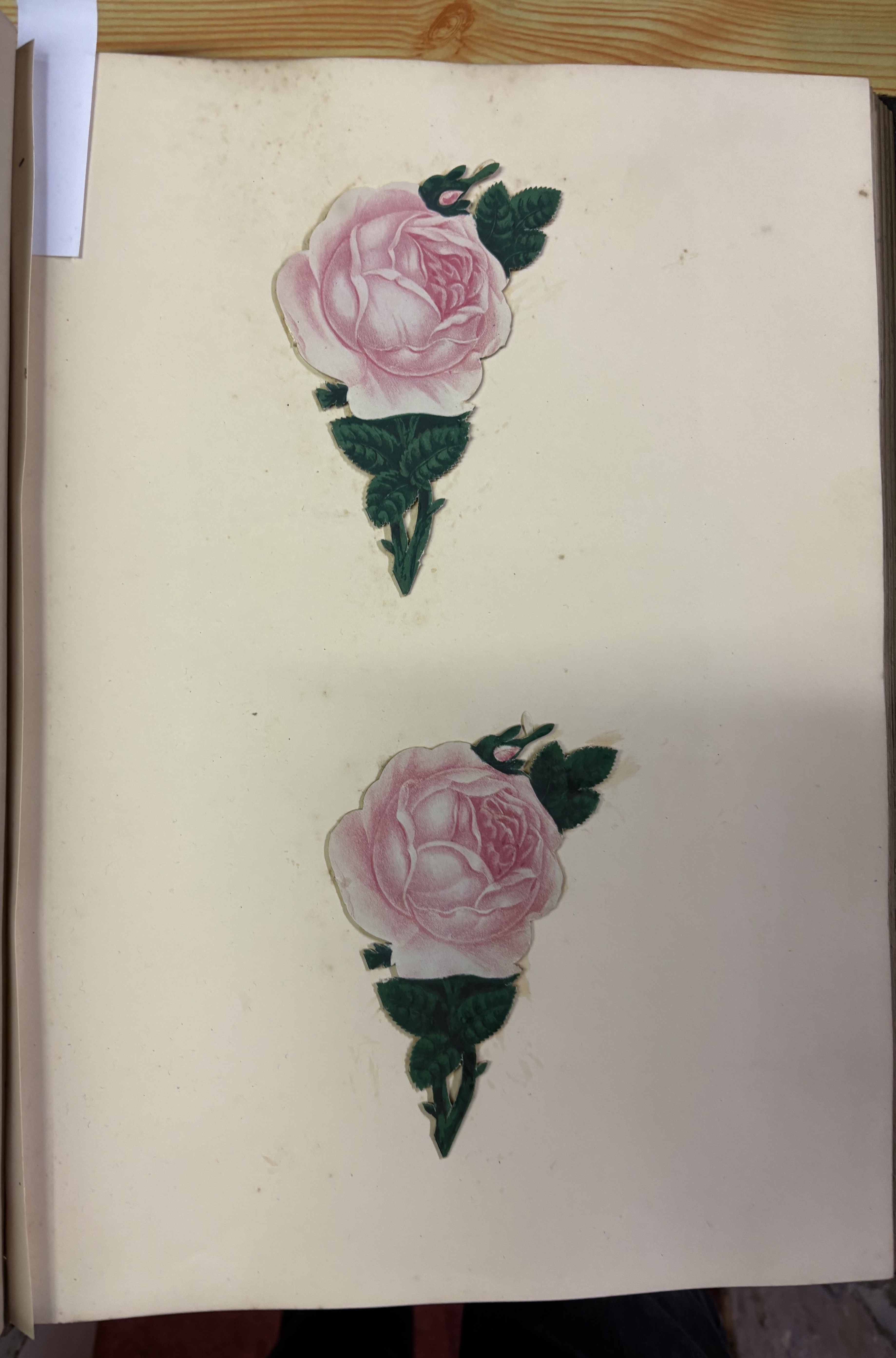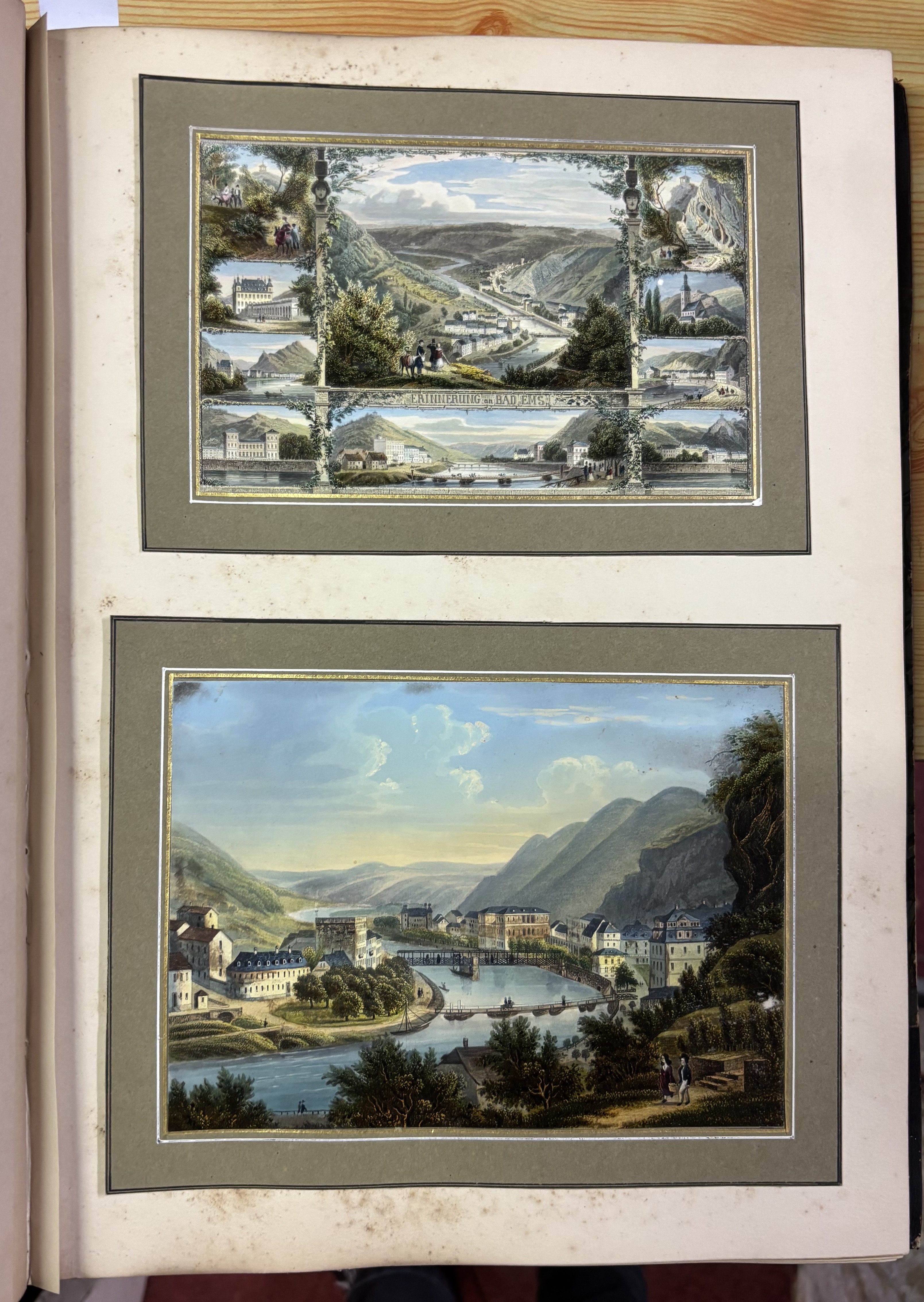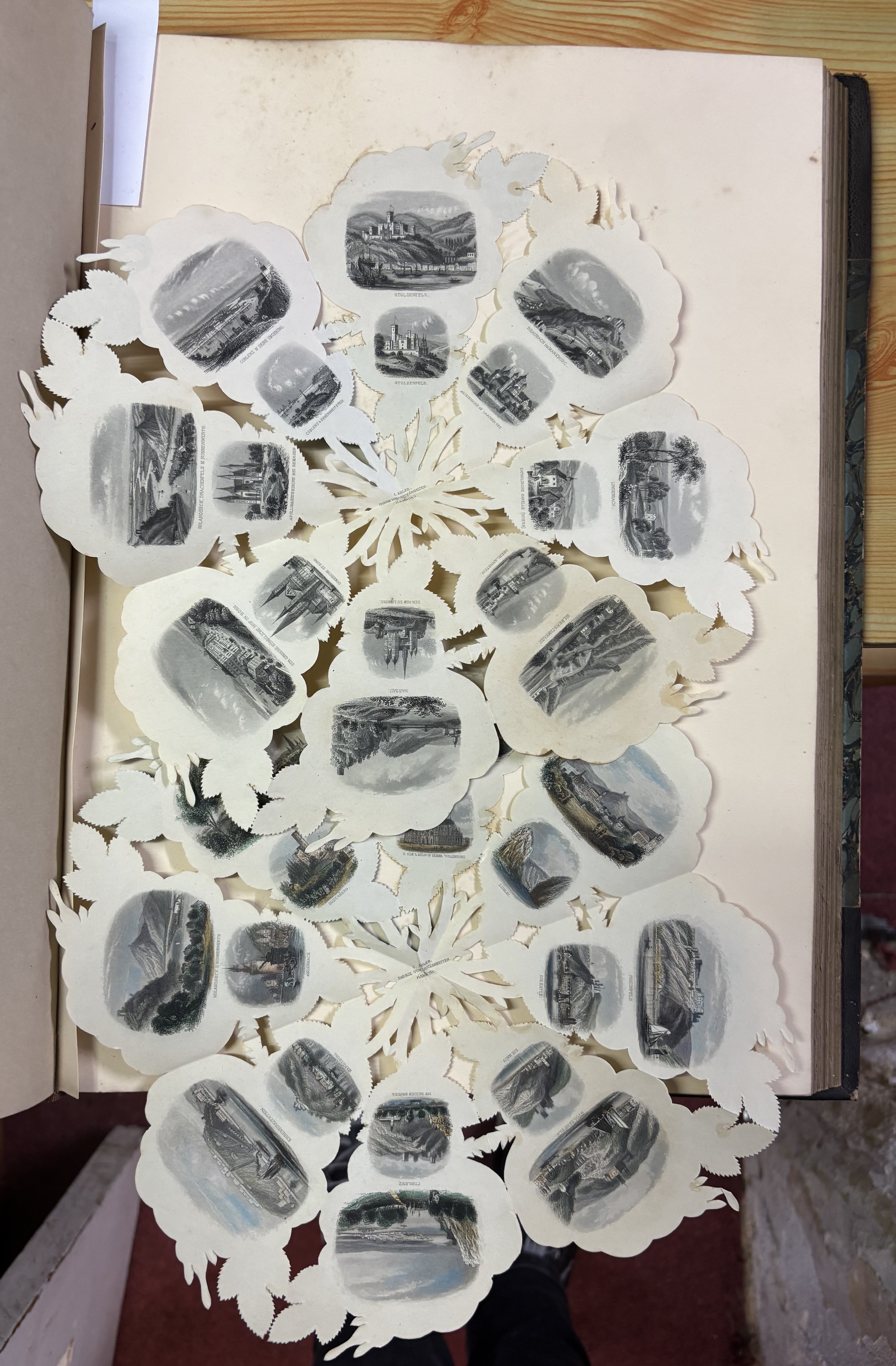Circa 1890, various prints, many of Belgium, two beautiful concertina rose cards which open out to reveal vignette engravings, one in black and white, the other in colour, some photographs to the rear, many blank pages. Half morocco.