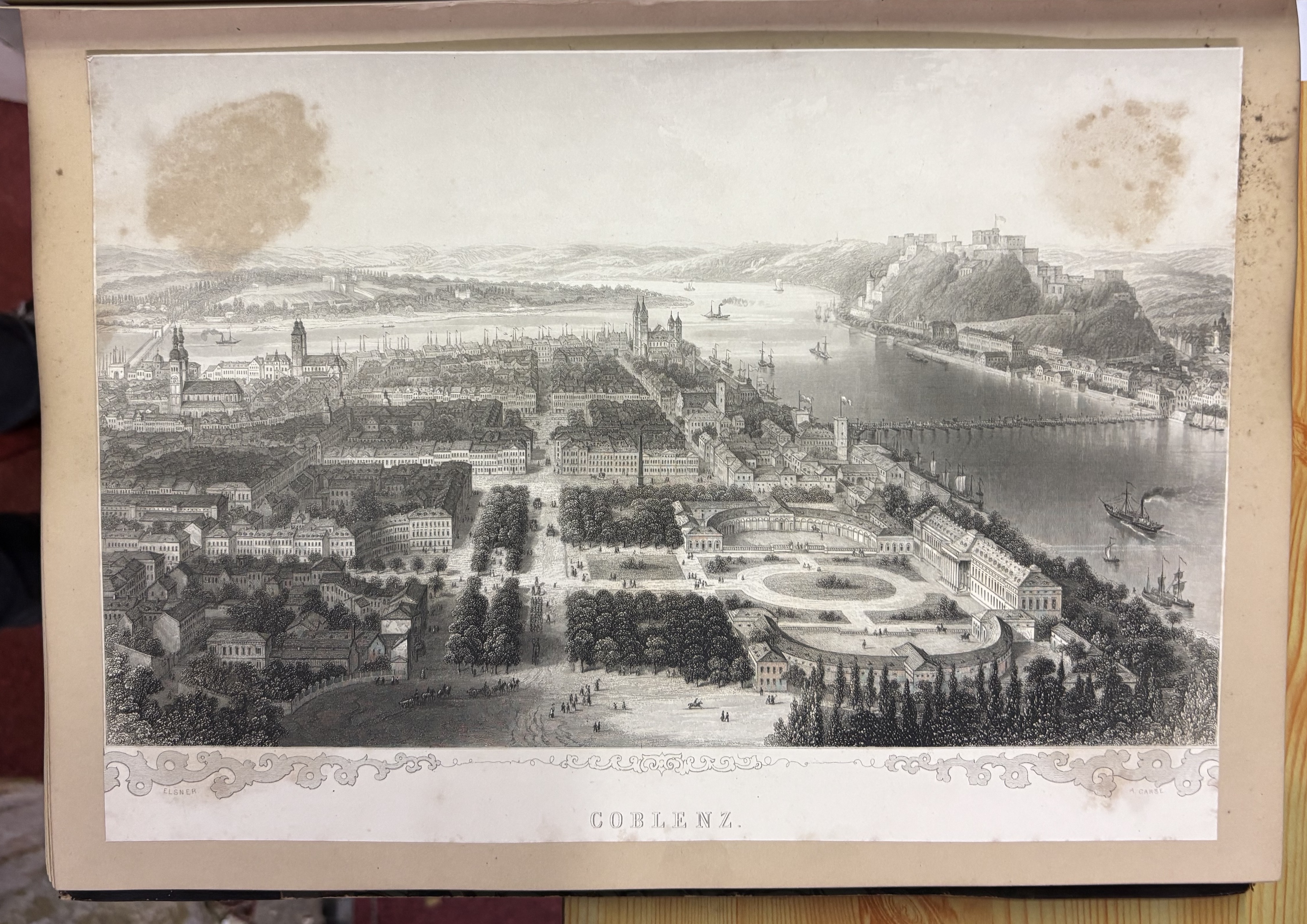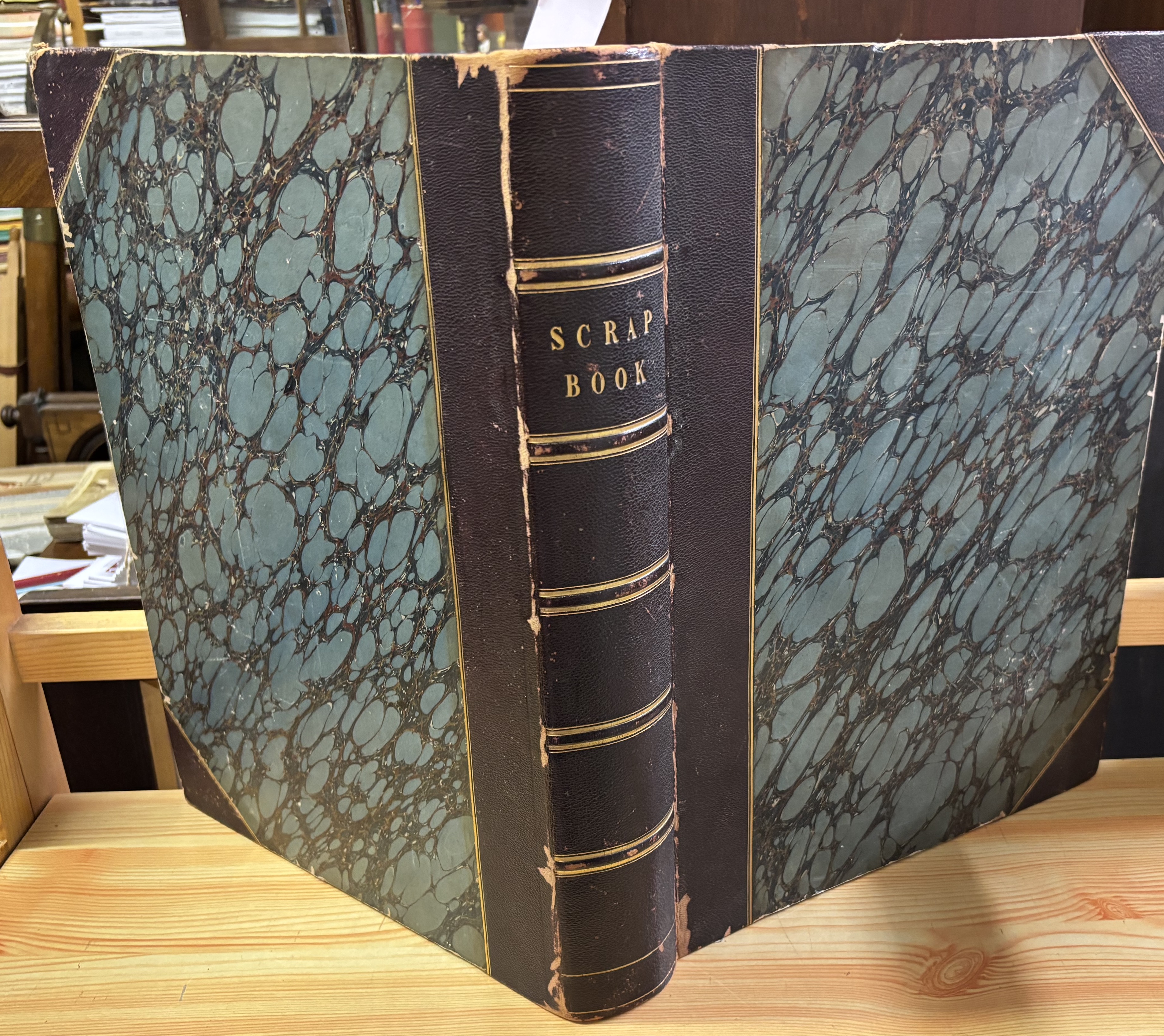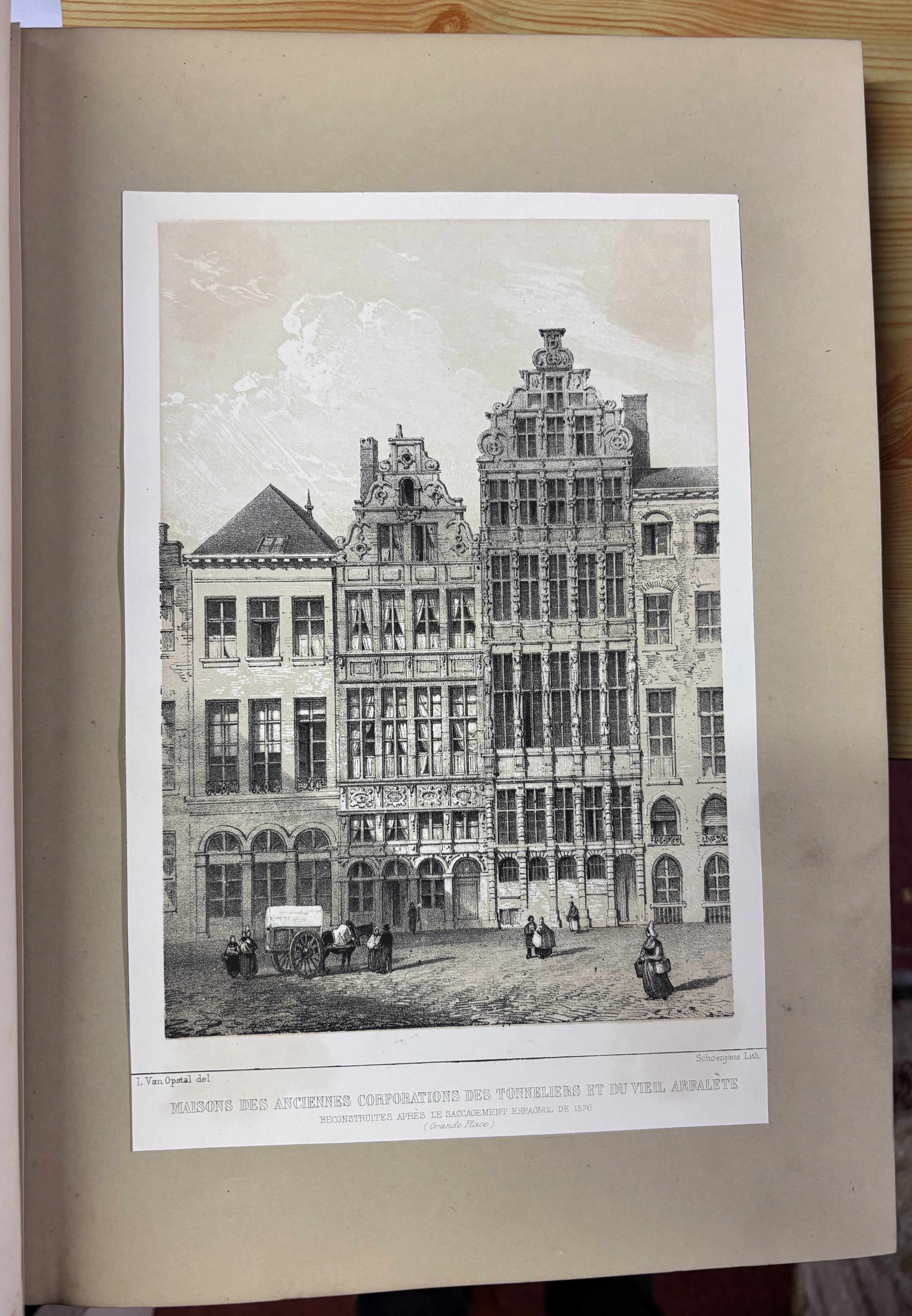 Circa 1890, various prints, many of Belgium, two beautiful concertina rose cards which open out to reveal vignette engravings, one in black and white, the other in colour, some photographs to the rear, many blank pages. Half morocco.