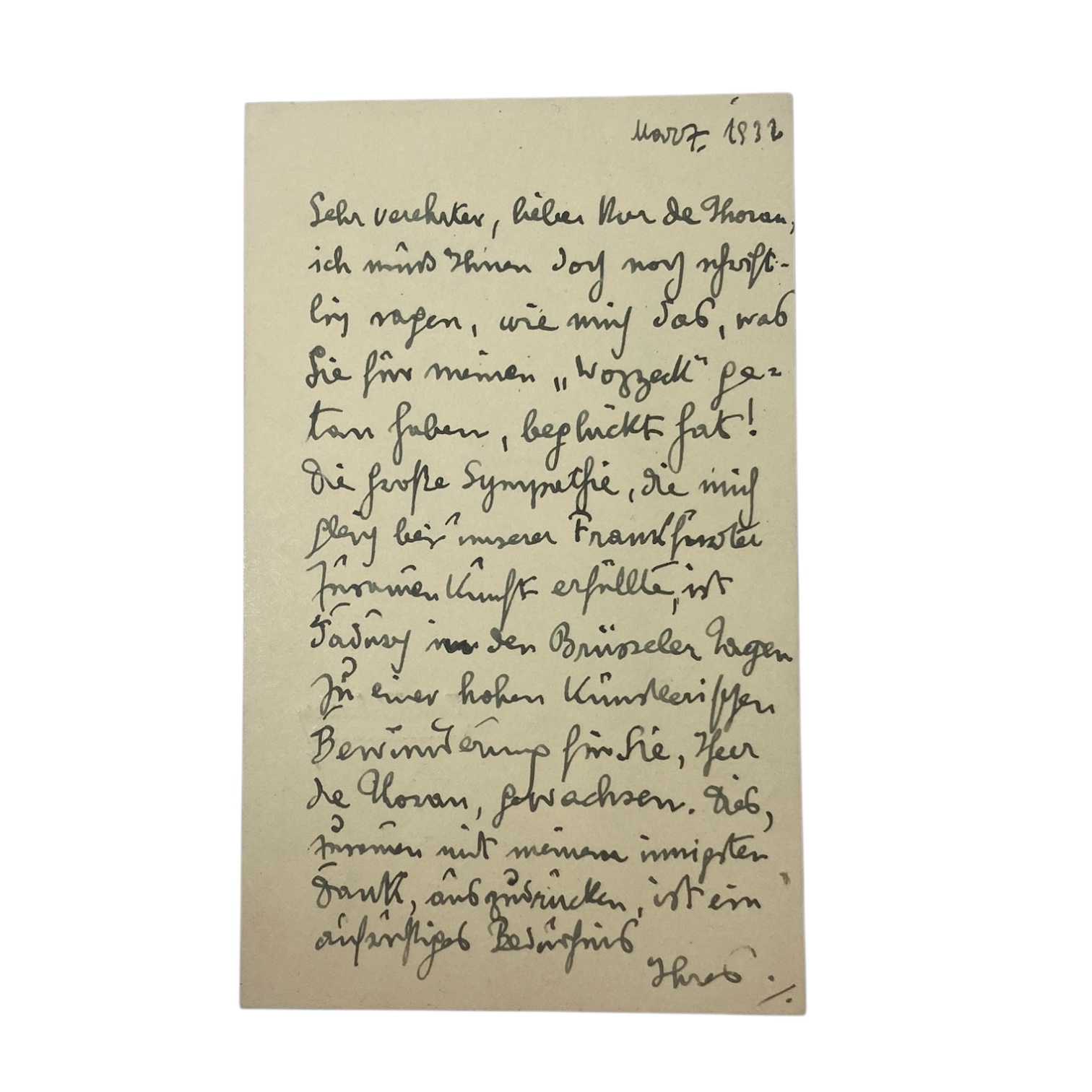 Portrait of Alban Berg (1885-1935) by renowned Viennese photographer Trude Fleischmann, signed by Berg beneath the image. On the verso is a signed letter from Berg to Corneil de Thoran dated March 1932, expressing his gratitude for de Thoran?s contribution to the first French-language staging of his opera Wozzeck at the Théâtre Royal de la Monnaie, Brussels, February 1932. The leading role, sung by Belgian bass Lucien Van Obbergh, proved challenging due to Berg?s modern style; initially he refused it, but de Thoran persuaded him and coached him through the score. The premiere was a critical success, praised for the orchestra and de Thoran?s spirited, sensitive conducting, prompting him to thank the musicians for upholding the theatre?s finest traditions. A photograph of Berg and de Thoran working together appears on the Wikipedia page for Wozzeck. Corneil De Thoran (1881-1953) is considered as one of the most emblematic figures in Belgian musical life of the first half of the 20th century and is credited with maintaining the highest performance standards as a conductor at La Monnaie. Trude Fleischmann (1895?1990) opened her Vienna studio at 25 and became one of the leading portrait photographers of her time, capturing prominent artists, intellectuals, and performers. Known for expressive, sometimes controversial imagery, she emigrated after the 1938 Anschluss, later establishing a successful New York studio. Beautiful item documenting a landmark of early 20th-century modernist opera. Wozzeck remains a cornerstone of the repertoire, celebrated for its narrative power and complex musical structure.