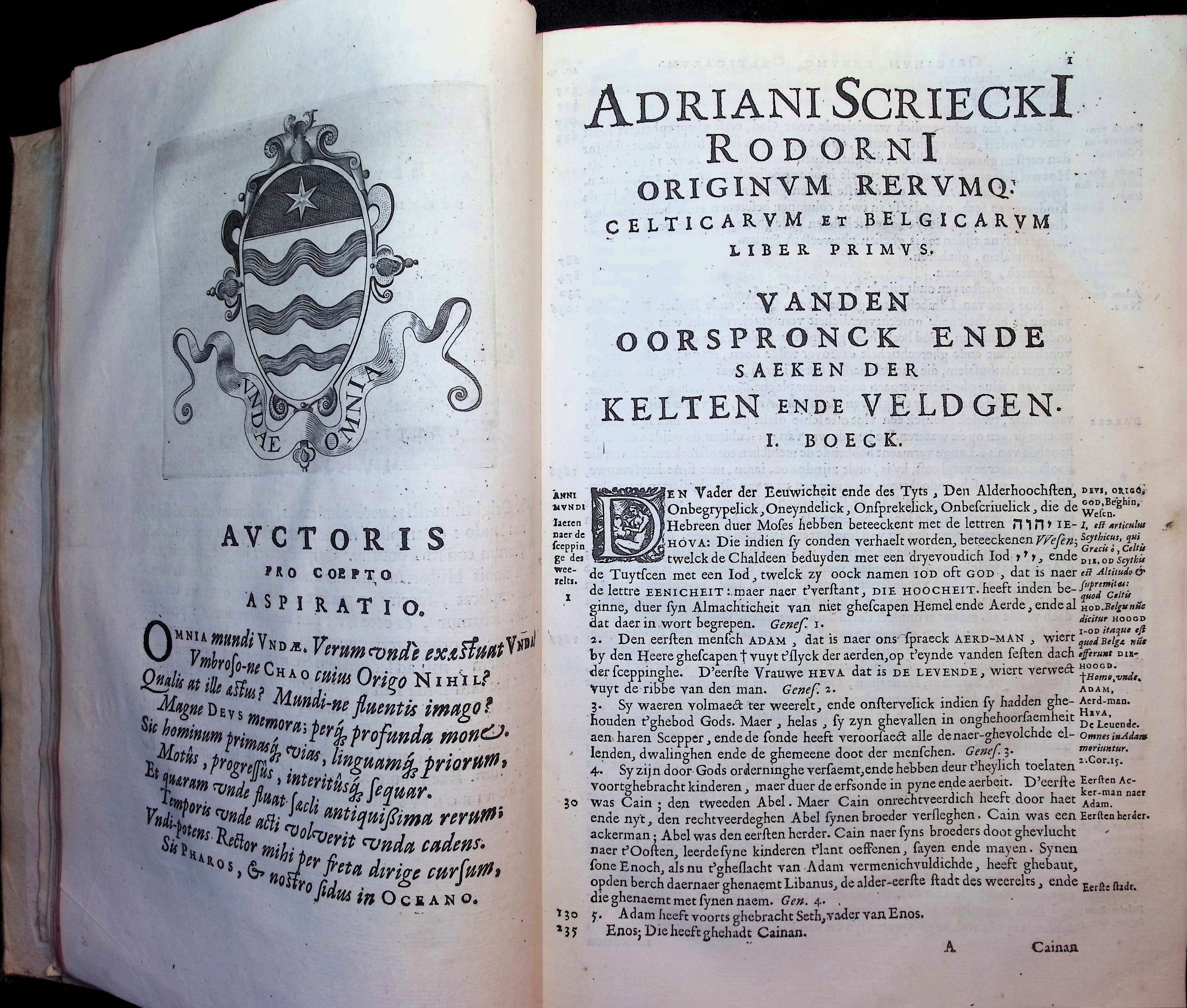 Eerste uitgave en zeldzame Ieperse druk van dit eigenaardige en erudiete werk in het Latijn en het Nederlands door Adriaen van Schrieck (Brugge 1560-1621 Ieper), heer van Rodorne, ambtenaar en historicus. Deze stelde dat het Nederlands als enige de verwoesting van de toren van Babel had overleefd en aldus de facto de basis vormde van alle andere talen zodat Hebreeuws, Grieks en Latijn als dialecten van het Nederlands dienden beschouwd, dit alles gestaafd door de meest absurde etymologische verklaringen. Het werk bevat een gegraveerde Latijnse titel, diens wapenschild gegraveerd door Guillaume de Tielt. Gebonden met, van dezelfde auteur en uitgever (samen 2 werken in 1 vol.) : Monitorum secundorum libri V. [...]. Idem, Id., 1615, [24]-63-[1 bl.-196-136-88] pp. Bevat een verdediging van hogergenoemde stellingen gestaafd door 3 indices of alfabetische lijsten met comparatieve taalkundige analyses van plaatsnamen (Brussel, Leuven, Luik...), van persoons- en zaaknamen en een onderzoek naar de stamvormen van naamwoorden.