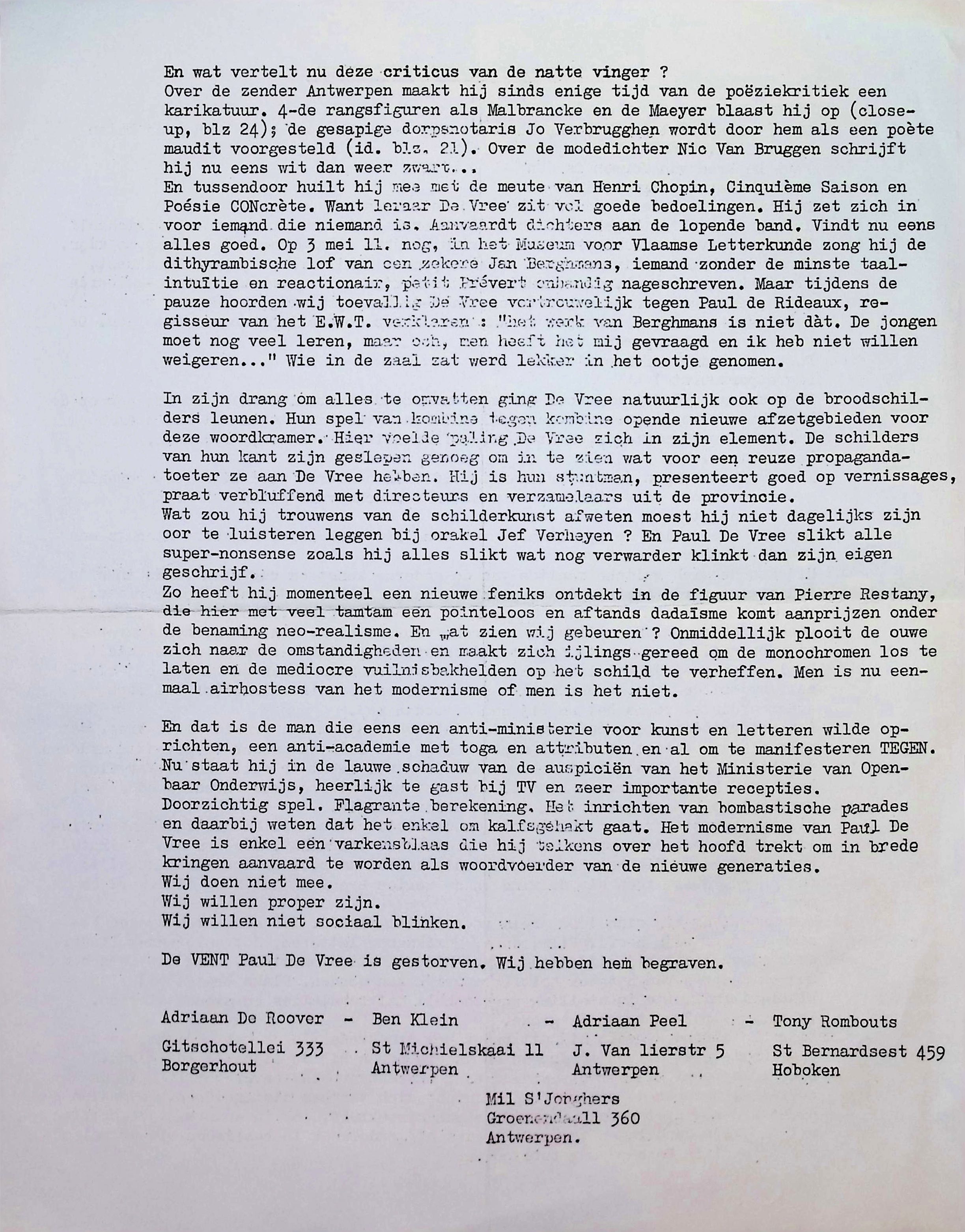 "De jongeren ergerden zich aan De Vree's paternalistische opstelling en zijn omgang met de door hem vroeger zo verafschuwde officiële kringen. De Vree, die altijd al gedroomd had van een grote avant-gardebeweging en enkel omwille van zijn politieke verleden jaren in de marge had vertoefd, was zich wellicht van geen kwaad bewust. Ten huize van Adriaan Peel werd niettemin besloten een weinig boeddhistisch-onthechte daad te stellen. Ben Klein, Adriaan de Roover, Tony Rombouts (van het blad Stuip), Peel en Emile 'S Jongers (van Filmgroep 58) ondertekenden een grotendeels door Klein geschreven pamflet met de veelzeggende titel 'De Vree - de Dood van een Criticus'. 'Het was een verschrikkelijk stuk scheldproza getuigt De Roover een kwarteeuw later, een afrekening in maffia-stijl. De reacties waren hevig. De ondertekenaars werden op hun beurt bestookt met verwijten en beledigingen. Nooit is er in de Vlaamse literatuur met zoveel vuiligheid gesmeten als in de zomer van 1963." Geert Beulens uit "Van Ostaijen tot heden".