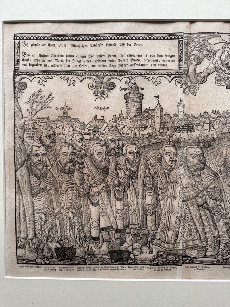 Nürnberg. Gesamtansicht (ohne Titel), im Vordergrund mittig Darstellung der Taufe Christi in der Pegnitz, seitlich davon jeweils 13 Porträts in ganzer Figur von Fürsten, Reformatoren und Förderern der Reformation. Anonymer Holzschnitt, um 1560; hier im vermutlich im späteren Abdruck des 17./18 Jahrhunderts.