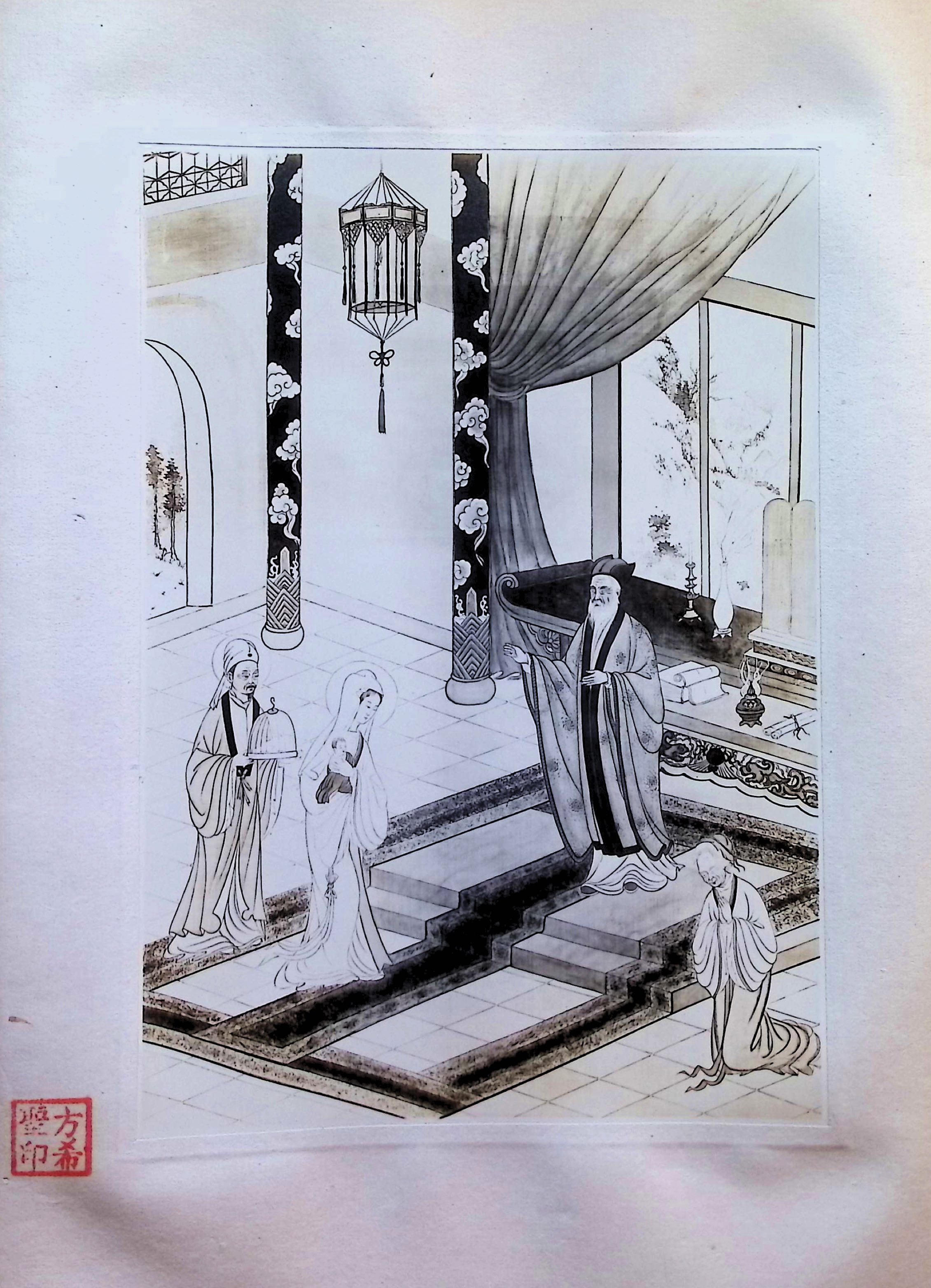 Een geschenk van Missionaris Mon Van Genechten aan Mgr. Morel, Bisschop Van Sui-Yuan. Gedateerd 2 januari 1940. Het boek bevat 8 scenes uit de bijbelse geschiedenis. 27 x 19 cm, op chinese wijze gebonden, twee houten platten. De bijbelse scenes zijn foto's van de werken van Mon Van Genechten, 20 x. 15cm. Al de foto's en de boodschap aan Mgr. Morel zijn gestempeld met zijn chinese naamstempel in rode inkt, Fang Xisheng. Een uniek document .