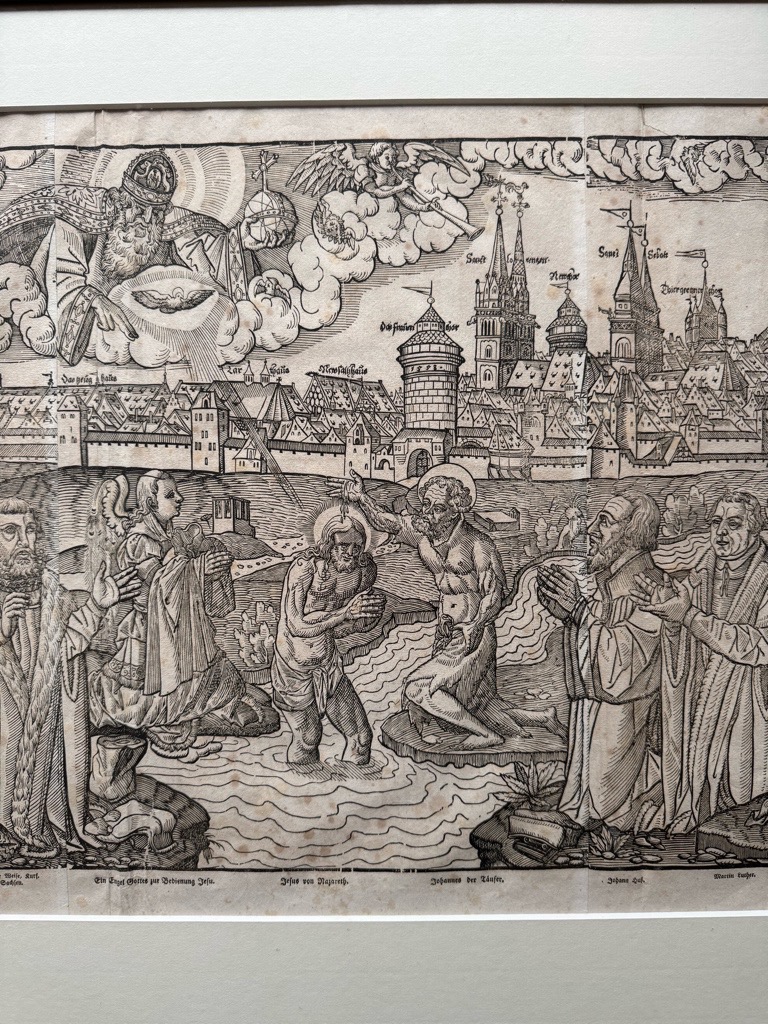 Vgl. Bachmann III, 765, Müller S. 71 u. Fauser 10 029. - Die sog. ?Reformatoren?-Ansicht, bereits mit den runden Türmen an den Toren mit den Jahreszahlen ihrer Erbauung 1556-58. Gerahmt. Die Zeit der Reformation ?vermutete/verlegte? die Taufe Jesu hingegen eher nach Nürnberg an die Pegnitz mit Blick auf damalige ?Hauptstadt der Reformation?. Selbstverständlich ließen sich dieses Ereignis weder die prot. Landesfürsten (zur Linken), noch die Reformatoren (zur Rechten) selbst entgehen, wir erkennen in trauter Eintracht u.a. Luther, Melanchthon, Hus, und viele mehr.