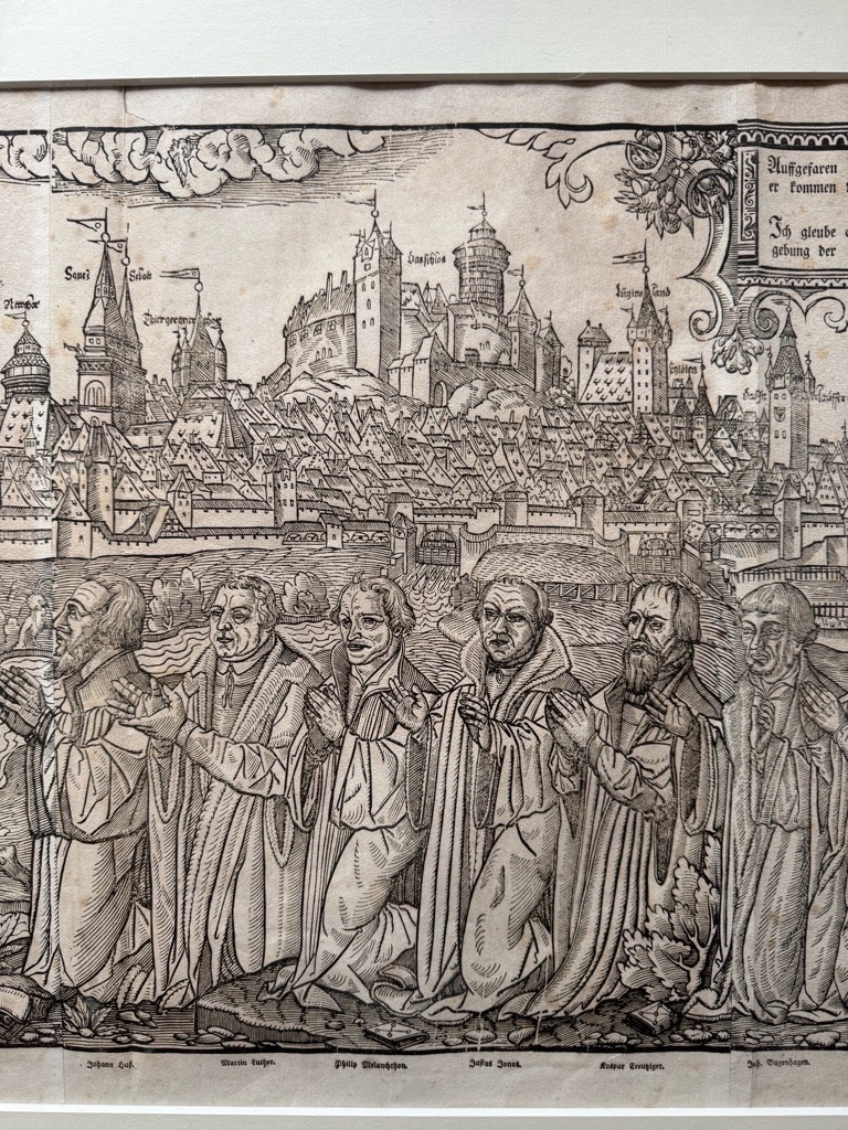 Nürnberg. Gesamtansicht (ohne Titel), im Vordergrund mittig Darstellung der Taufe Christi in der Pegnitz, seitlich davon jeweils 13 Porträts in ganzer Figur von Fürsten, Reformatoren und Förderern der Reformation. Anonymer Holzschnitt, um 1560; hier im vermutlich im späteren Abdruck des 17./18 Jahrhunderts.