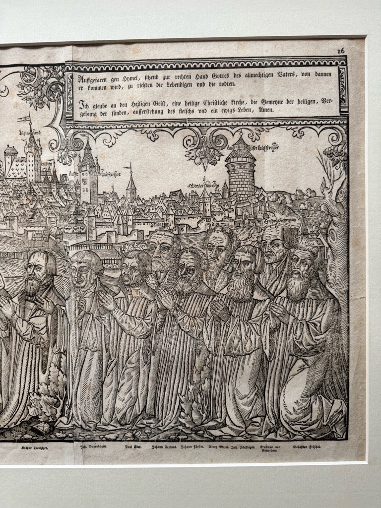 Anonym. Die Taufe Christi in der Pegnitz Reformatorenansicht / Nürnberg Gesamtansicht (ohne Titel) im Vordergrund mittig die Darstellung der Taufe Christi in der Pegnitz, seitlich davon 13 Porträts in ganzer Figur von Fürsten, Reformatoren und Förderern der Reformation. Anonymer Holzschnitt. o.O. o. V., 1569 ( wohl späterer Abdruckdes 17./18.Jahrhunderts.. Mit 2 ornament. Kart. in den Oberecken mit dt. Versen. Von fünf Stöcken gedruckt und zusammengesetzt; 36,5:133 cm, darunter Legende.