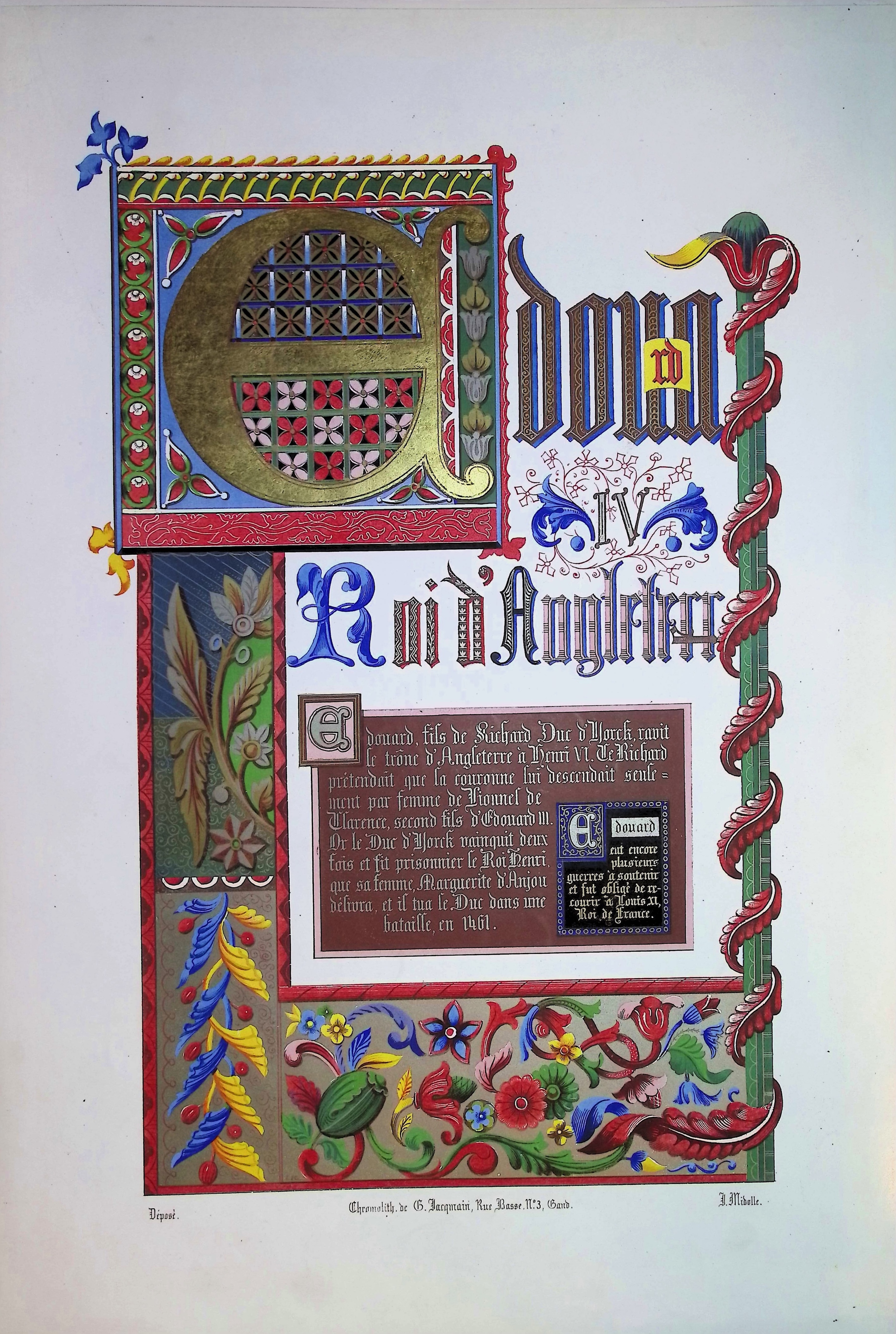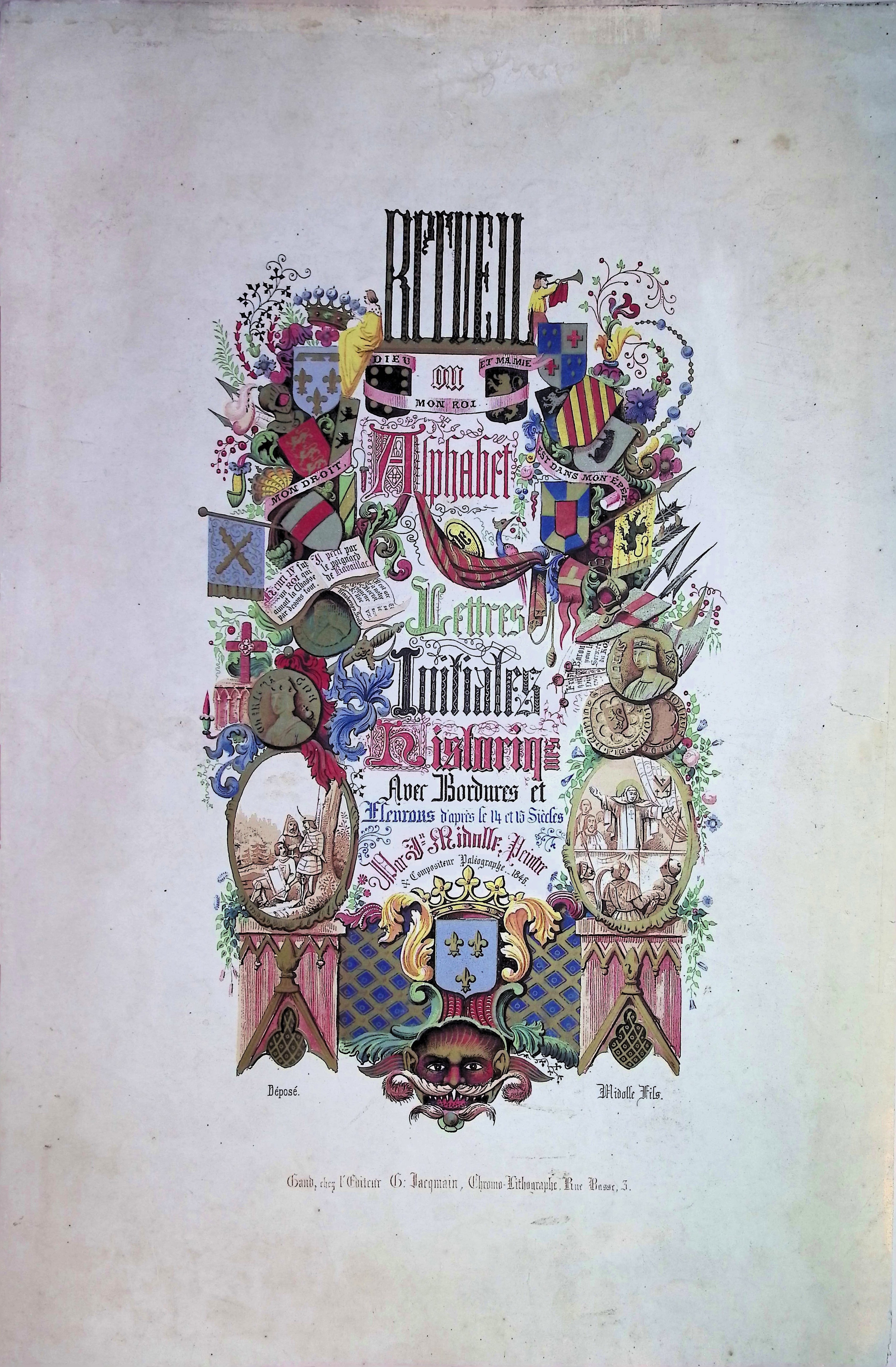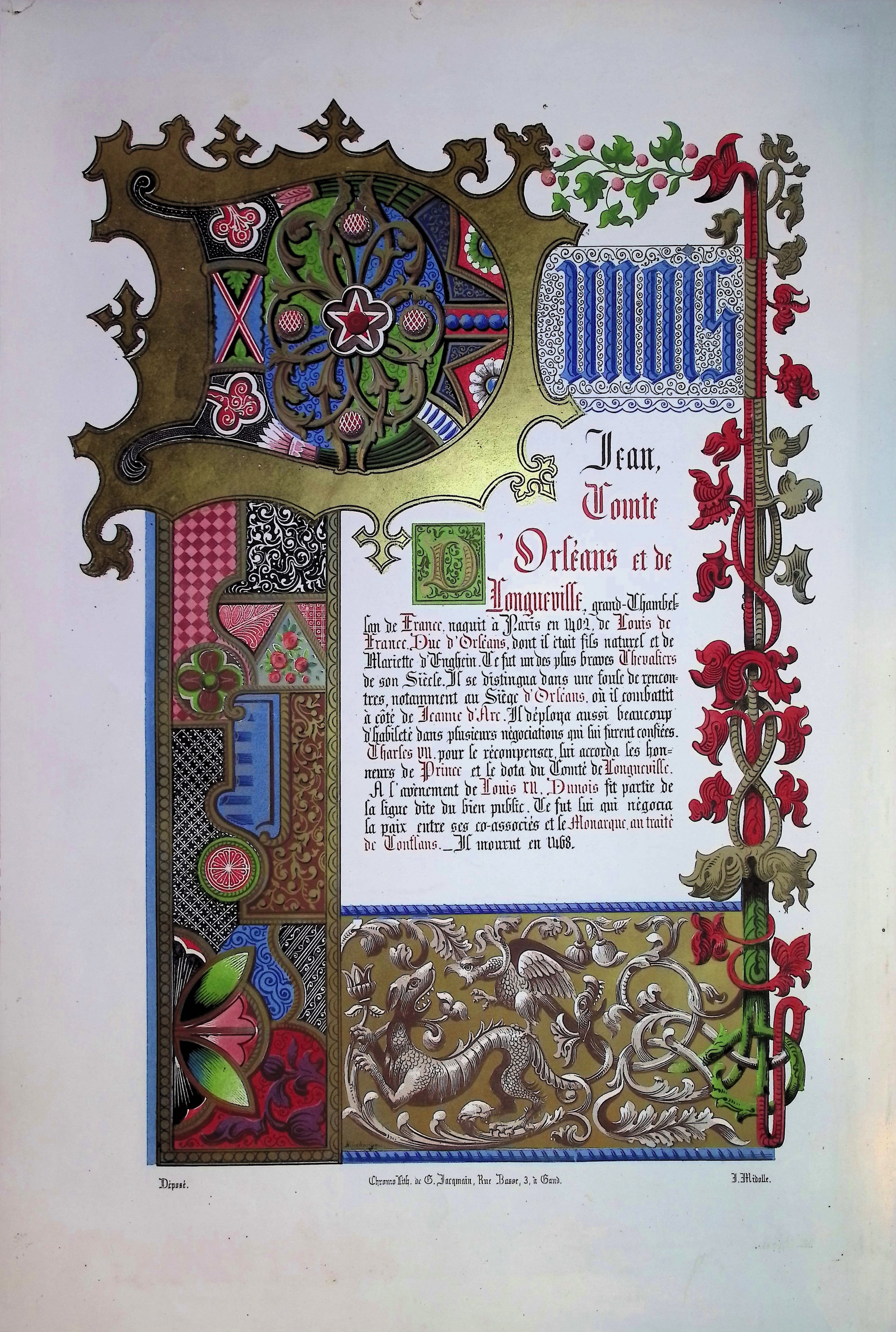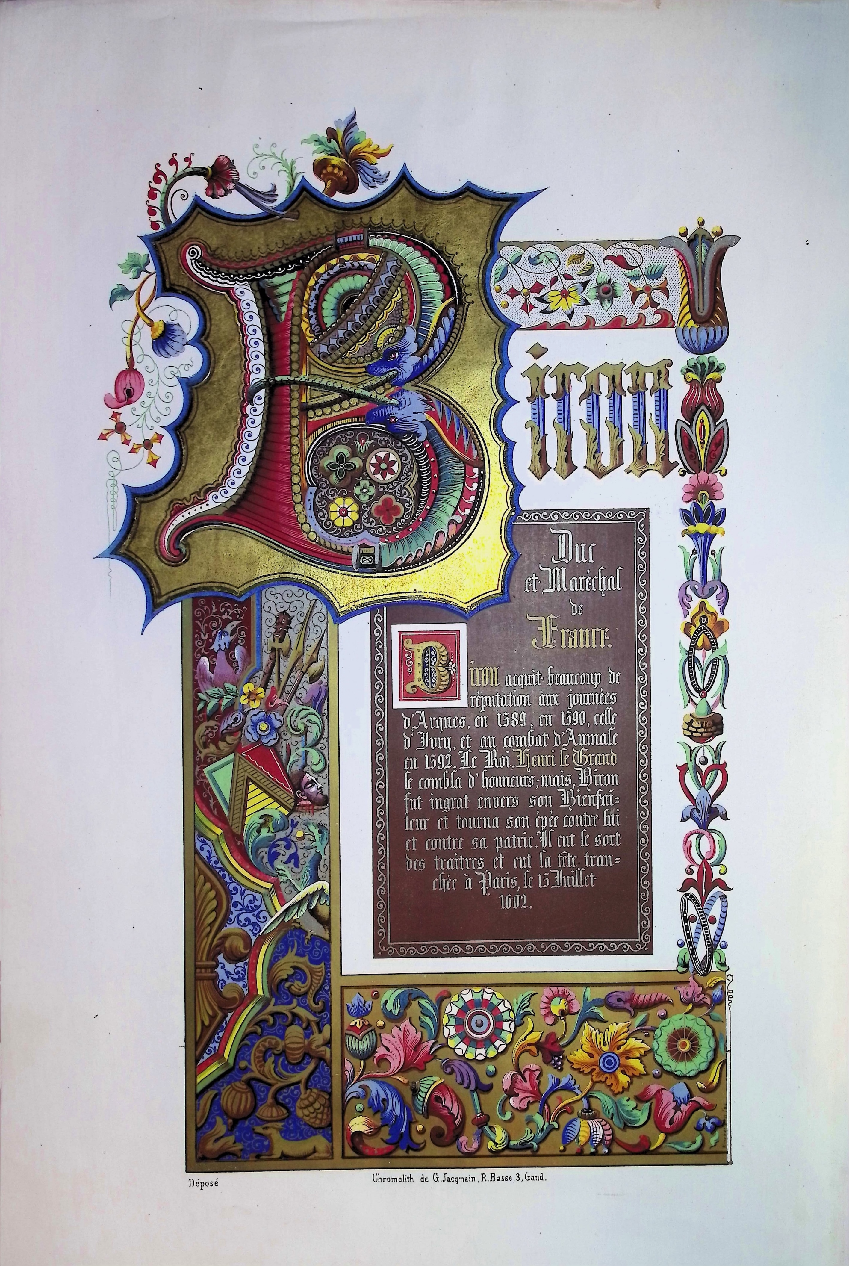 Gand, G. Jacqmain, 1846.Un grand et fort volume (47 x 32,5 cm) composé d'une page de titre et de 24 planches en chromolithographie imprimées sur papier cérusé (dit carton porcelaine) . Non relieé. Les feuilles de carton porcelaine Ces impressions, entre 1835 et 1860 environ, étaient surtout utilisées comme support commémoratifs, commerciaux ou publicitaires.Il s agit ici d un Abécédaire composé par de beaux spécimens de pages inspirées de manuscrits des XIVe et XVe siècles, très colorées, aux bordures historiées ornées de fleurs et animaux fantastiques. Les planches présentent une courte biographie de personnages historiques dont Anne de Bretagne, Édouard d'Angleterre, Gustave-Adolphe de Suède, Louis XIV, Marie de Médicis, le peintre anversois Quintin, Richard Coeur de Lion, Sully, Turenne. la page de titre est souillée. Certaines pages présentent des déchirures et/ou de petites pertes de papier. Il s'agit néanmoins d'un très bon exemplaire,