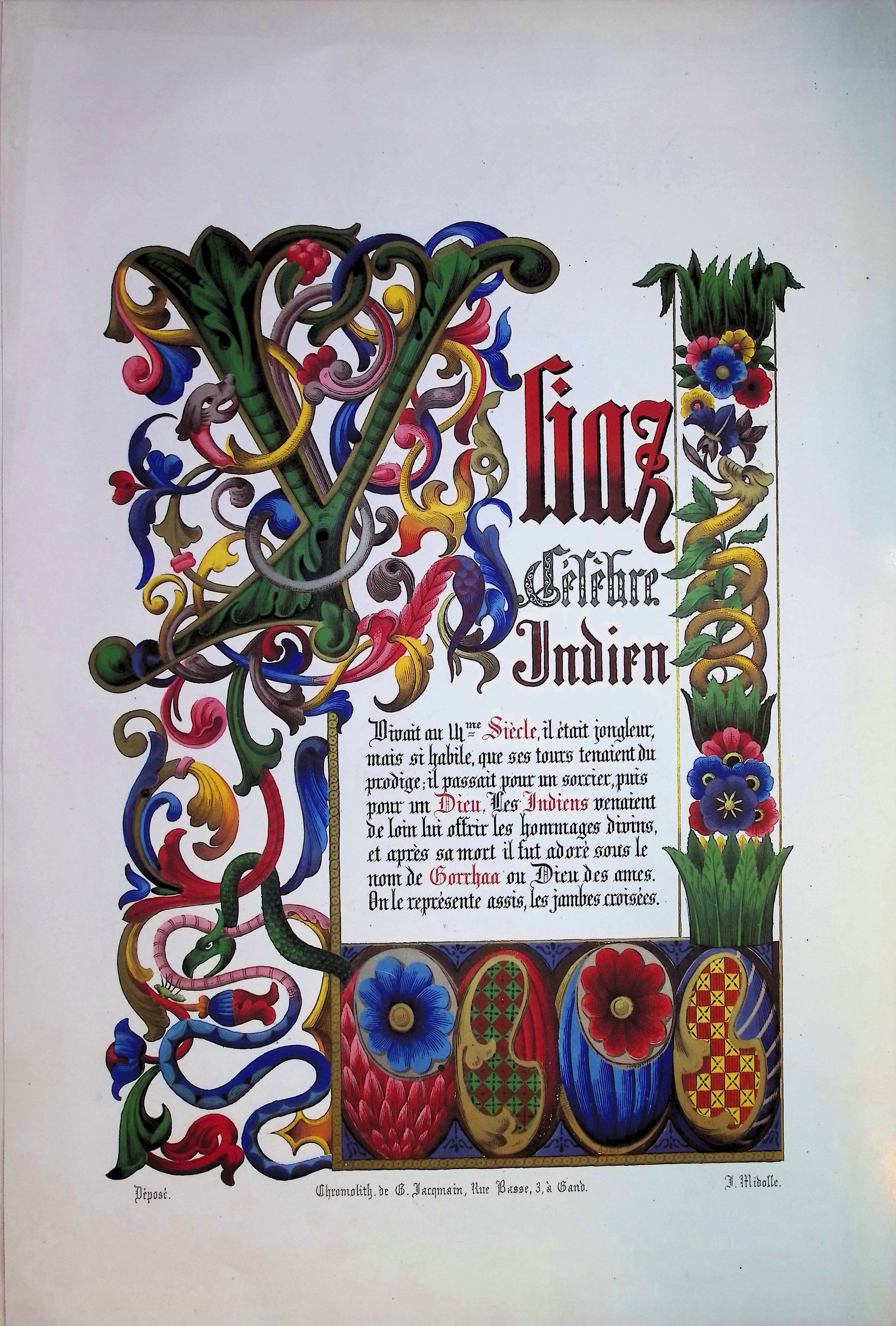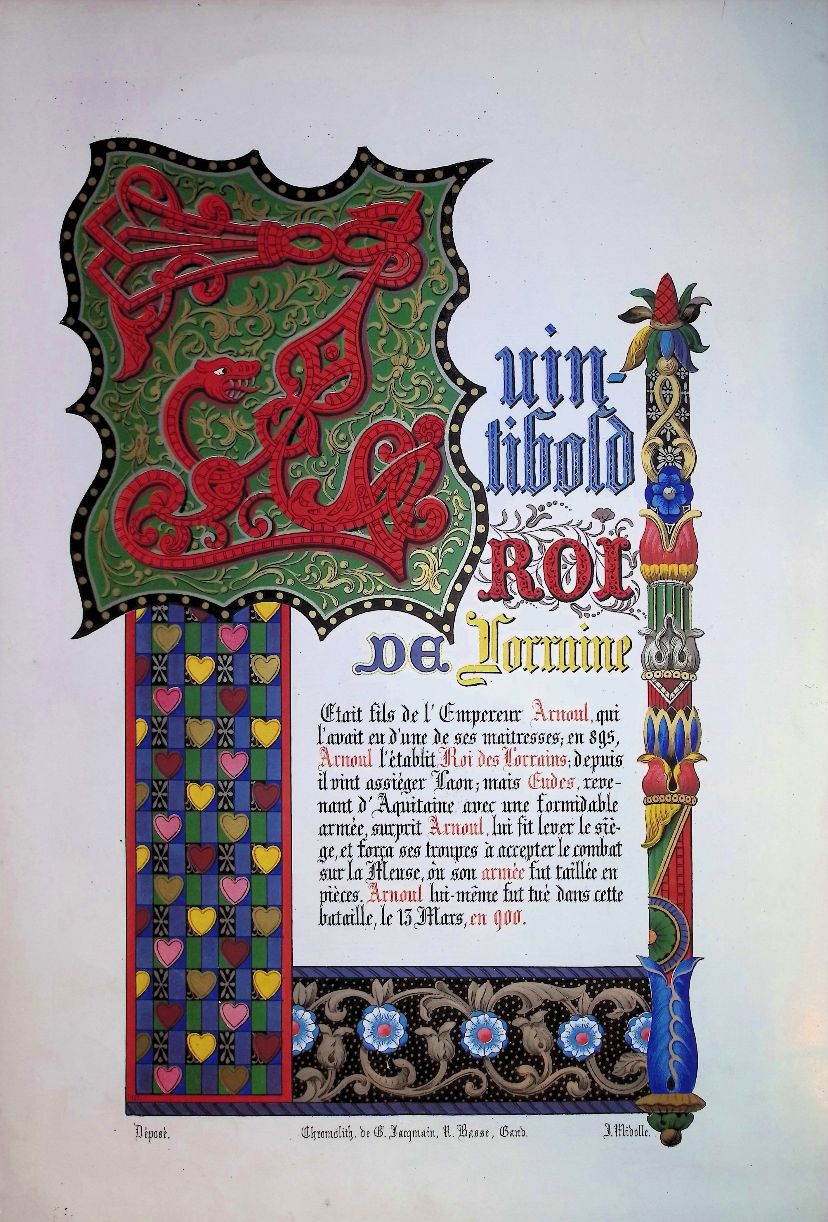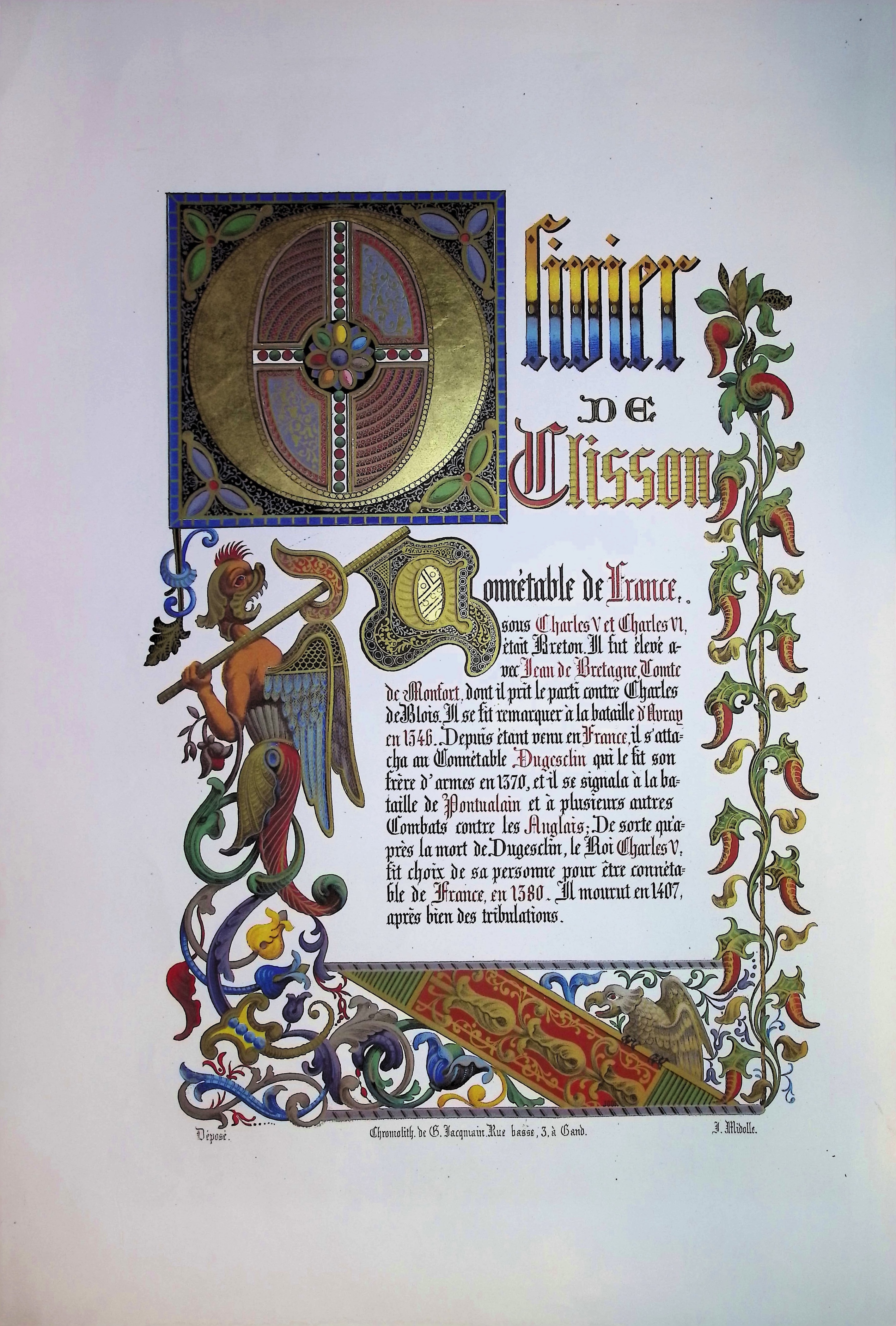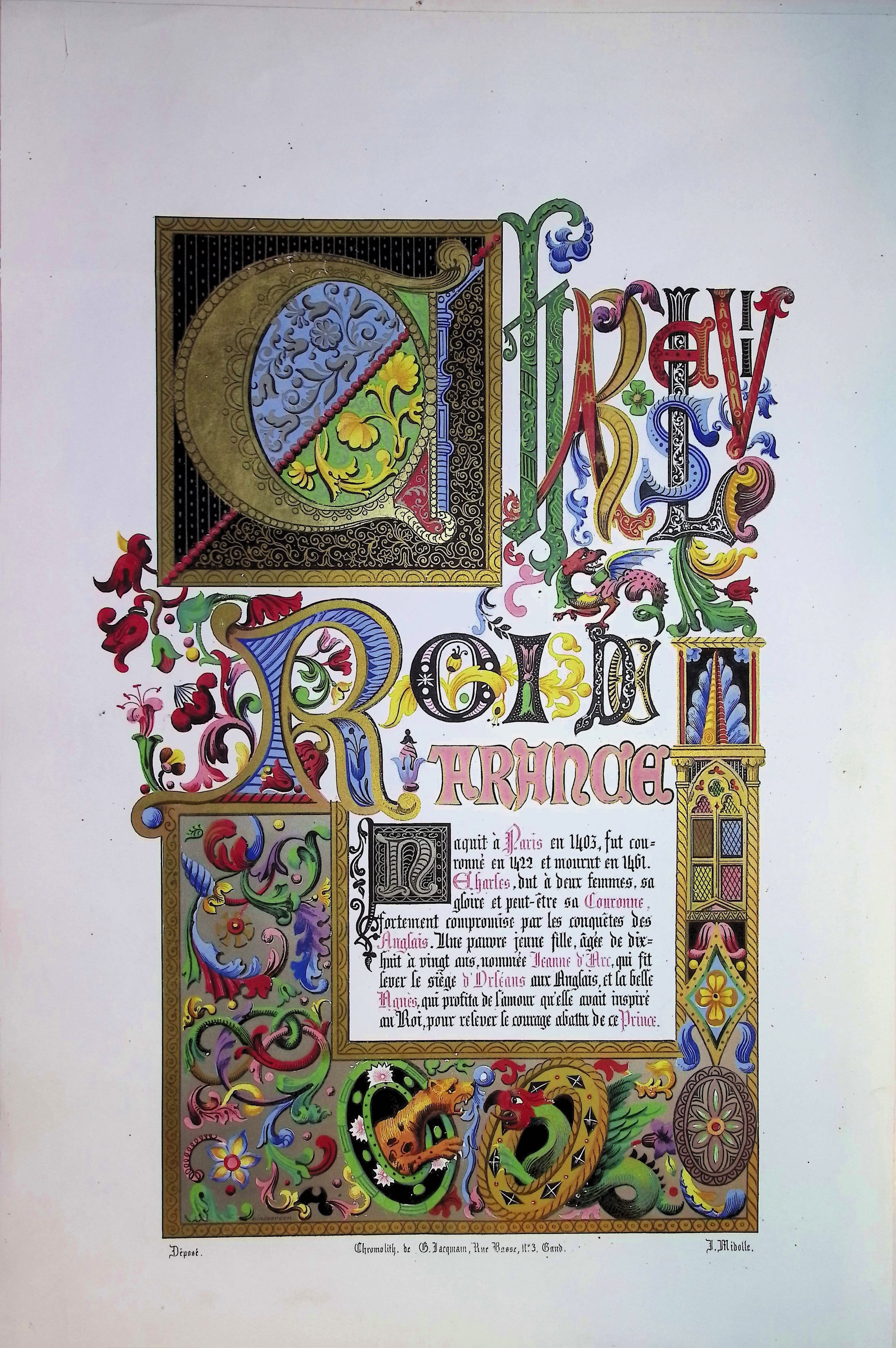Gand, G. Jacqmain, 1846.Un grand et fort volume (47 x 32,5 cm) composé d'une page de titre et de 24 planches en chromolithographie imprimées sur papier cérusé (dit carton porcelaine) . Non relieé. Les feuilles de carton porcelaine Ces impressions, entre 1835 et 1860 environ, étaient surtout utilisées comme support commémoratifs, commerciaux ou publicitaires.Il s agit ici d un Abécédaire composé par de beaux spécimens de pages inspirées de manuscrits des XIVe et XVe siècles, très colorées, aux bordures historiées ornées de fleurs et animaux fantastiques. Les planches présentent une courte biographie de personnages historiques dont Anne de Bretagne, Édouard d'Angleterre, Gustave-Adolphe de Suède, Louis XIV, Marie de Médicis, le peintre anversois Quintin, Richard Coeur de Lion, Sully, Turenne. la page de titre est souillée. Certaines pages présentent des déchirures et/ou de petites pertes de papier. Il s'agit néanmoins d'un très bon exemplaire,