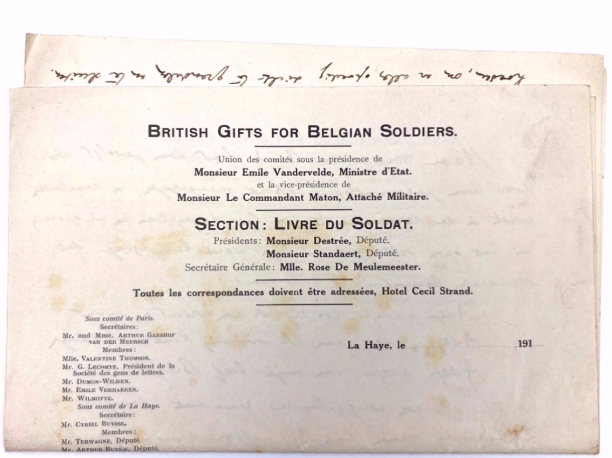 Buysse schreef dit fragment over op de achterzijde van voorbedrukt briefpapier van ?British Gifts for Belgian Soldiers / Section: Livre du Soldat?, organisatie waarvan hij tijdens de oorlog secretaris werd van de Haagse afdeling.