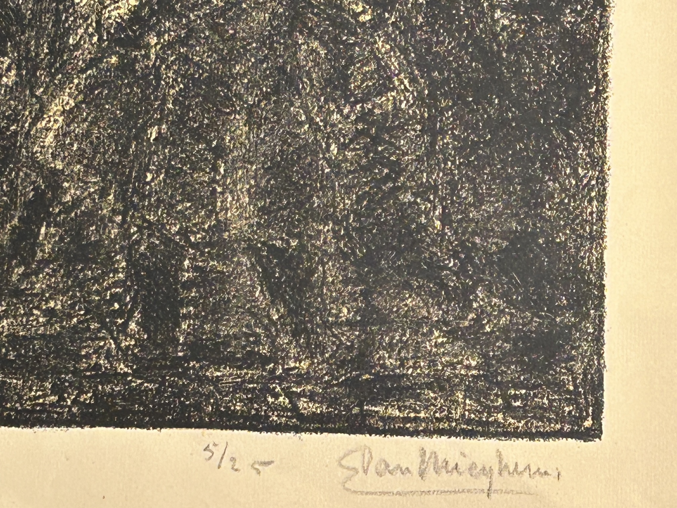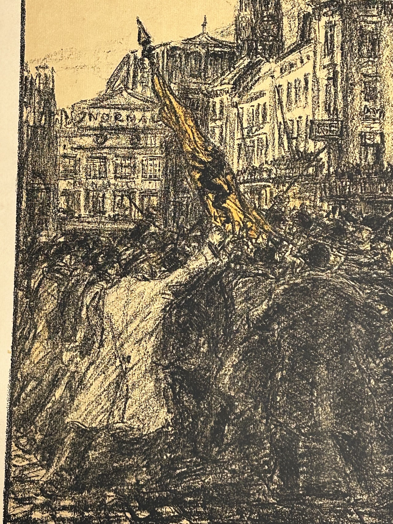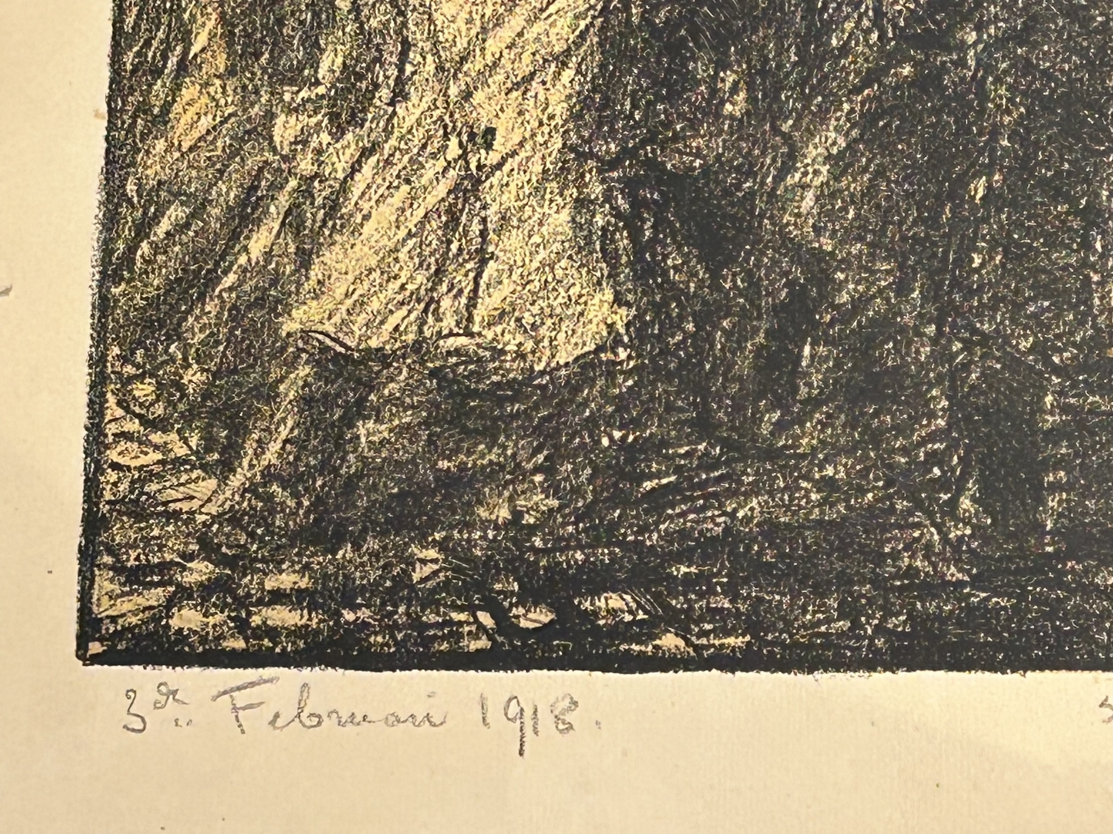 kleurenlitho: 55,5 x 44,5 cm, gesigneerd in de plaat als in potlood buiten de plaat. genummerd 5/25 exemplaren. Titel 3de februari 1918