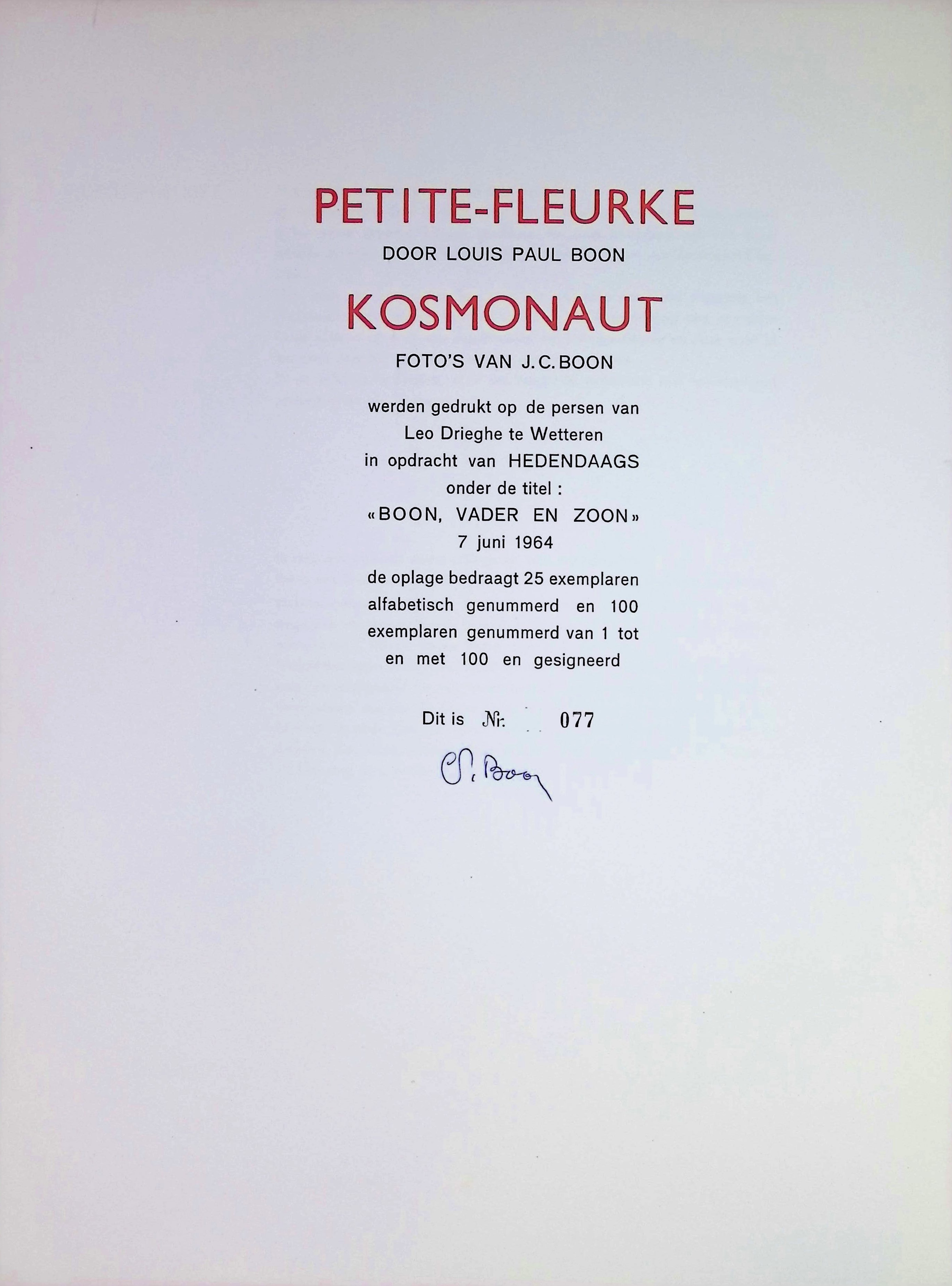 4to (32 x 24 cm), los in de originele farde : 14 blz + 4 pagina-grootte foto?s, - Kortverhaal "Petit-Fleurke" van L.P. Boon en 4 foto's "Kosmonaut" van J.C. Boon. Oplage van 125 ex. gesign. door de auteur en de kunstenaar. Nr: 77 gesigneerd