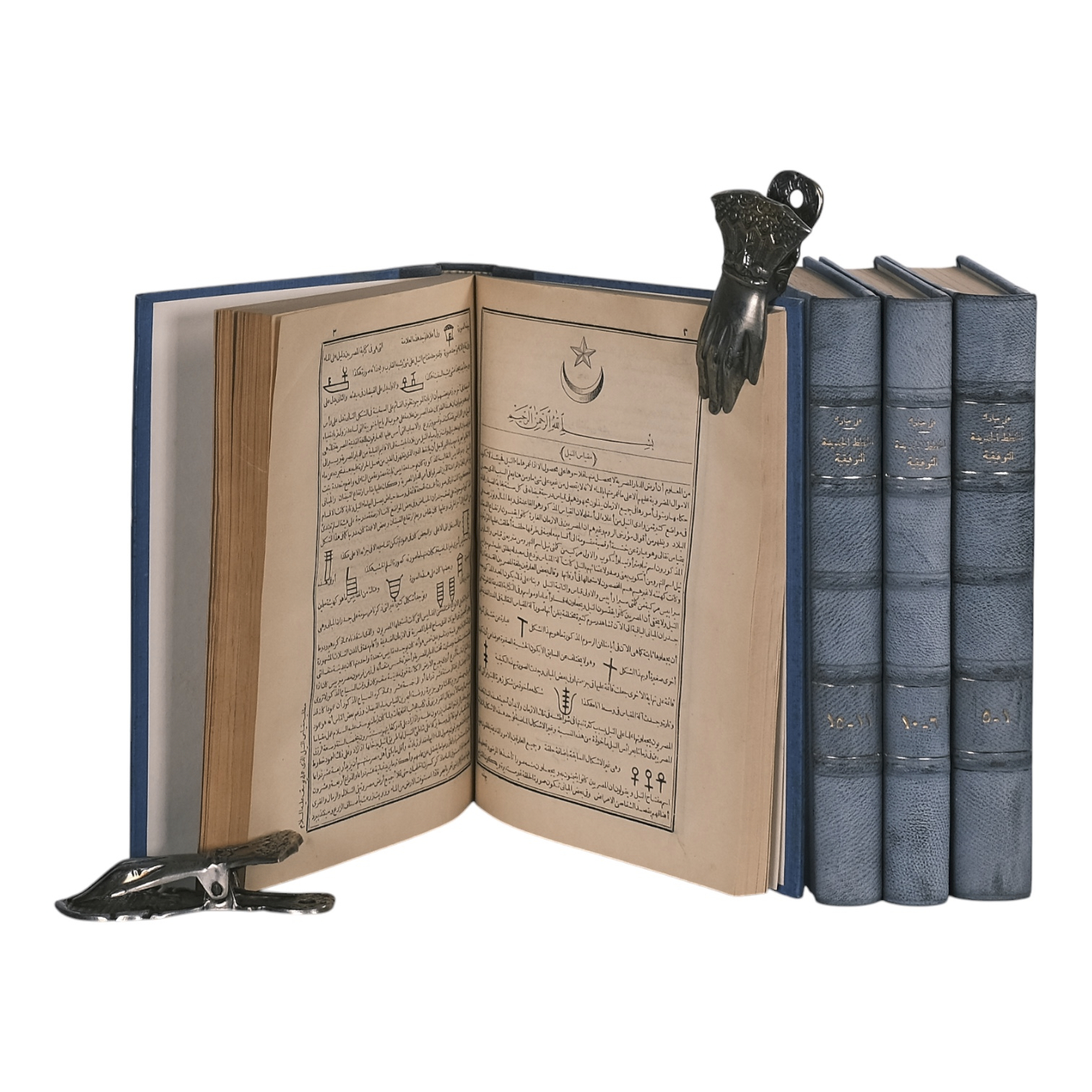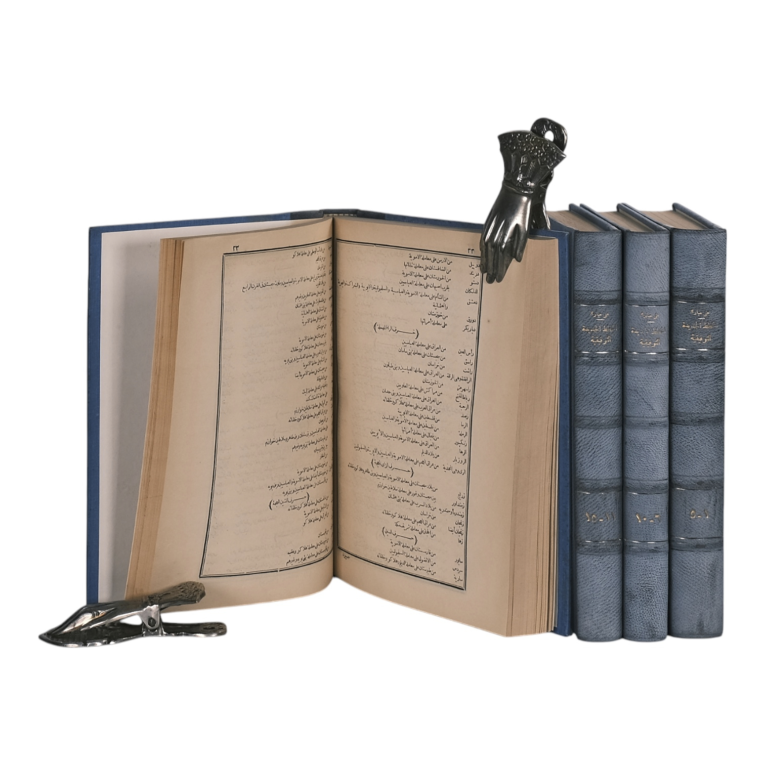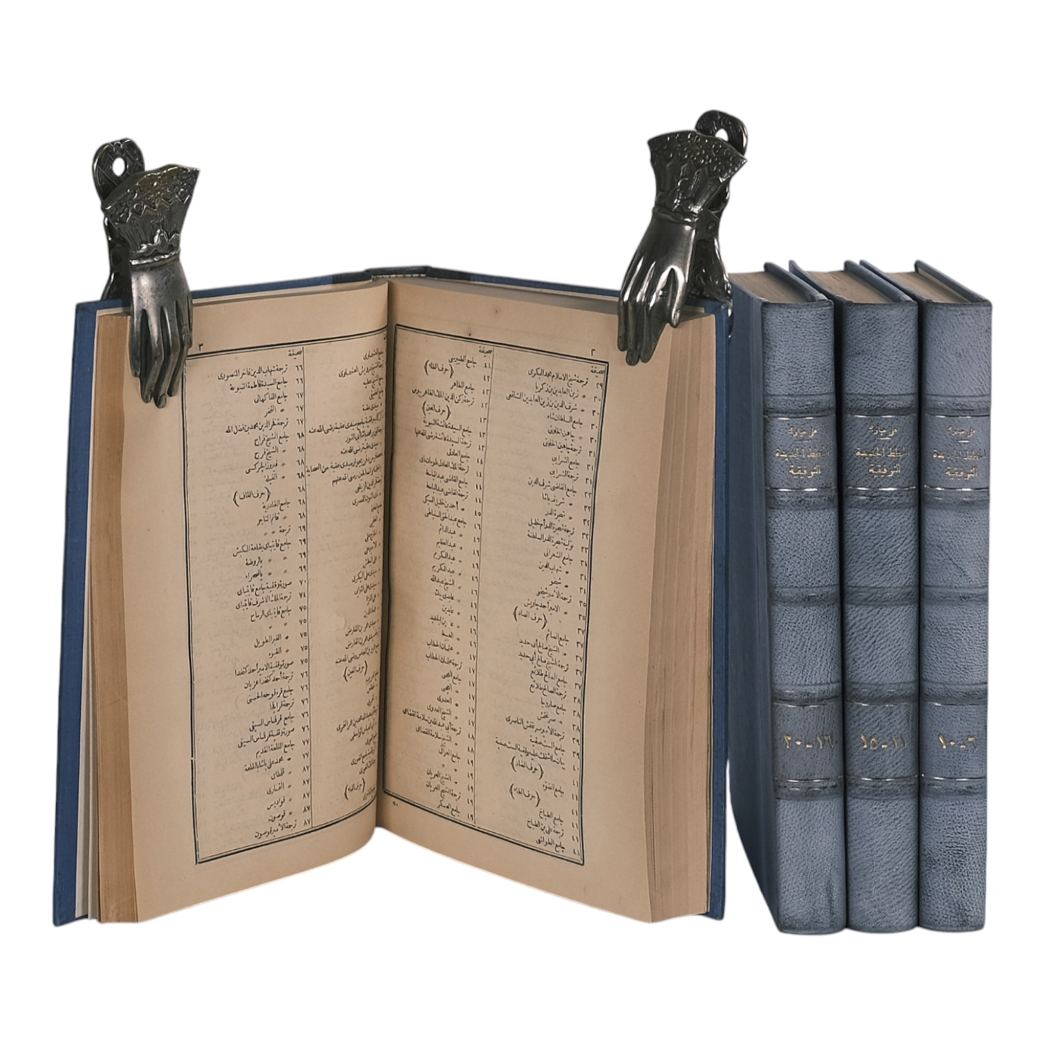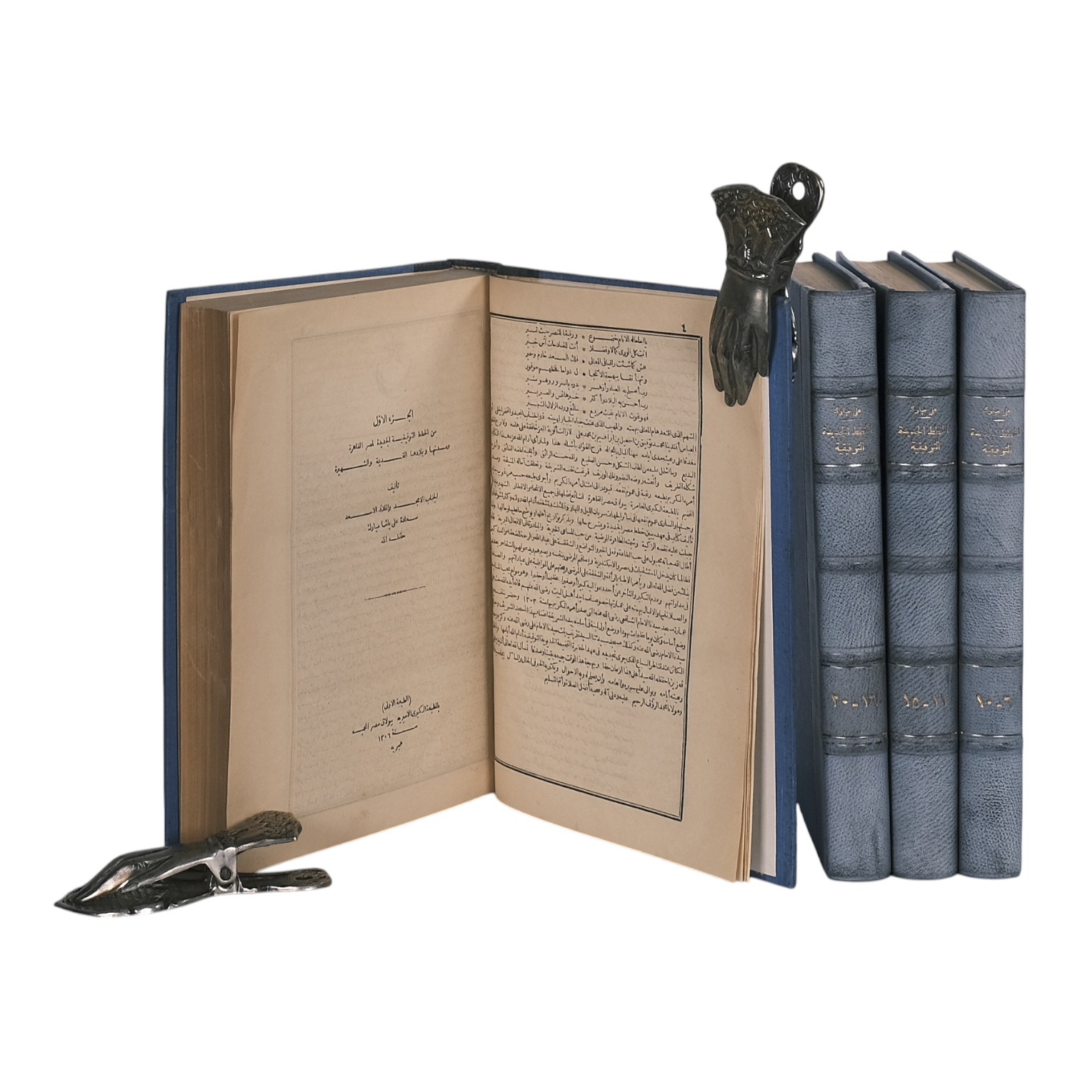 The Great Royal Press, Bulaq, Cairo, 1886-1889. Rare complete set of 20 volumes, bound in four books. Size 27.5 x 20.5 cm. The text is entirely in Arabic. Bound in blue half leather with raised bands; the leather is faded due to sun exposure. The paper has yellowed and browned over time, showing fragility. Some pages have small tears, and a few larger tears have been repaired with pasted paper. Each volume contains a stamp from the previous owner. Weight is 5.3 kg. See pictures.