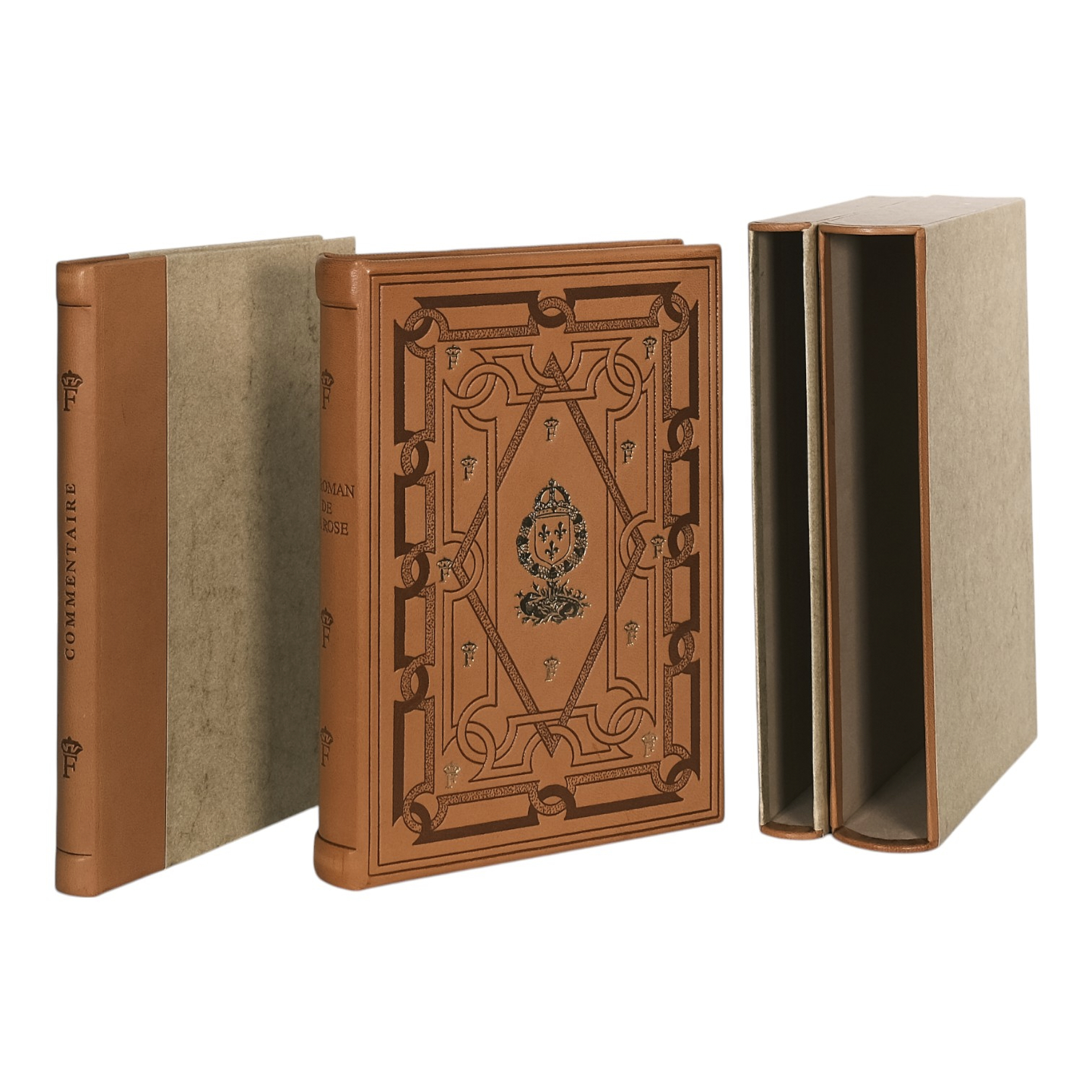 Two volumes in slipcases. Facsimile volume bound in full leather with blind-stamped gilt and decorations, commentary volume bound in half leather. Facsimile reproduces manuscript M.948 from the Pierpont Morgan Library, New York. Commentary includes annotations by Margareta Friesen, translated into French by Sylvie Jacques, and an essay by Georges Duby. Limited edition of 980 numbered copies, this is number 105. Printed by Akademische Druck- u. Verlagsanstalt in Graz (facsimile) and Sallaz in Lyon (commentary), bound by the Centre de Limoges. Text in French. Both volumes in excellent condition, see pictures.