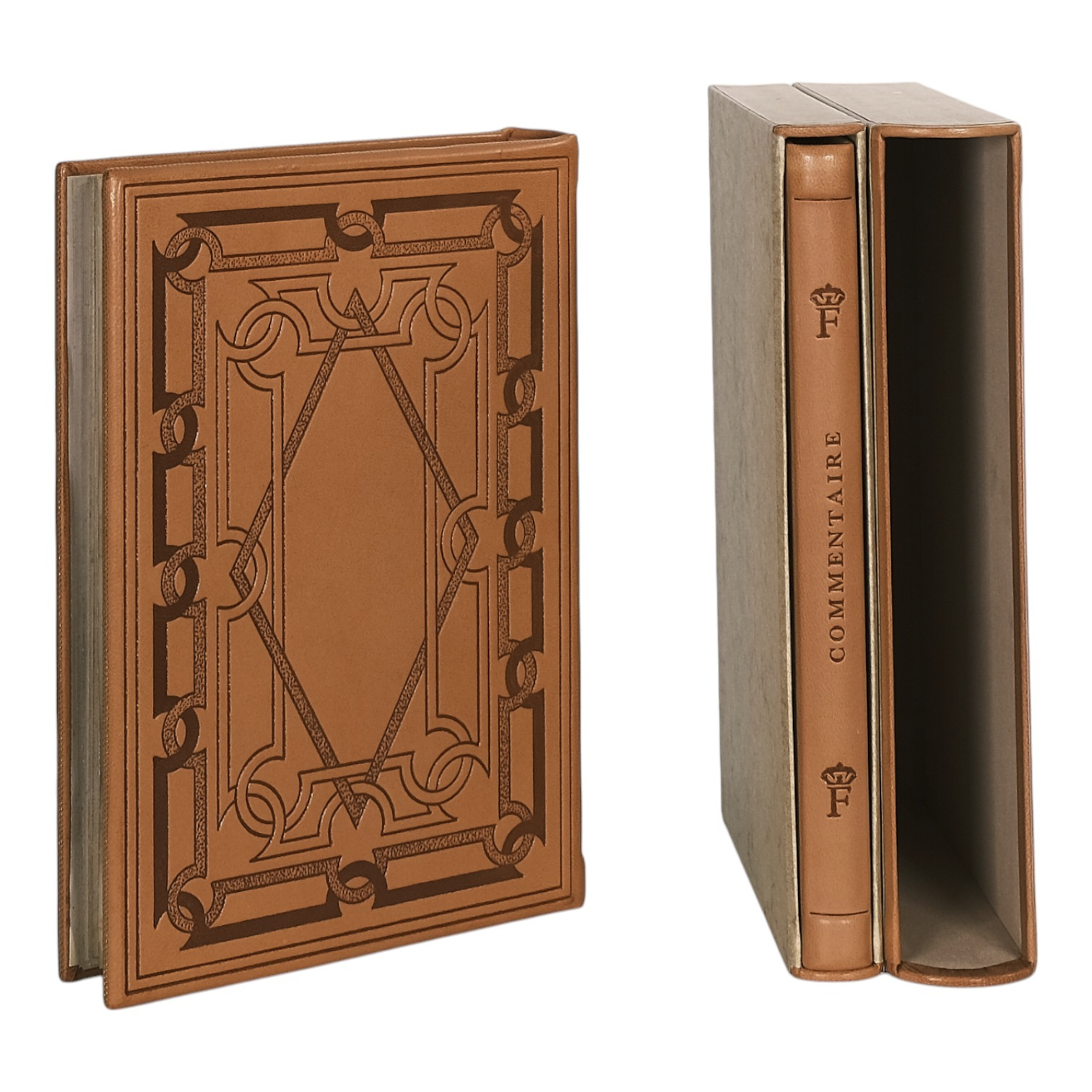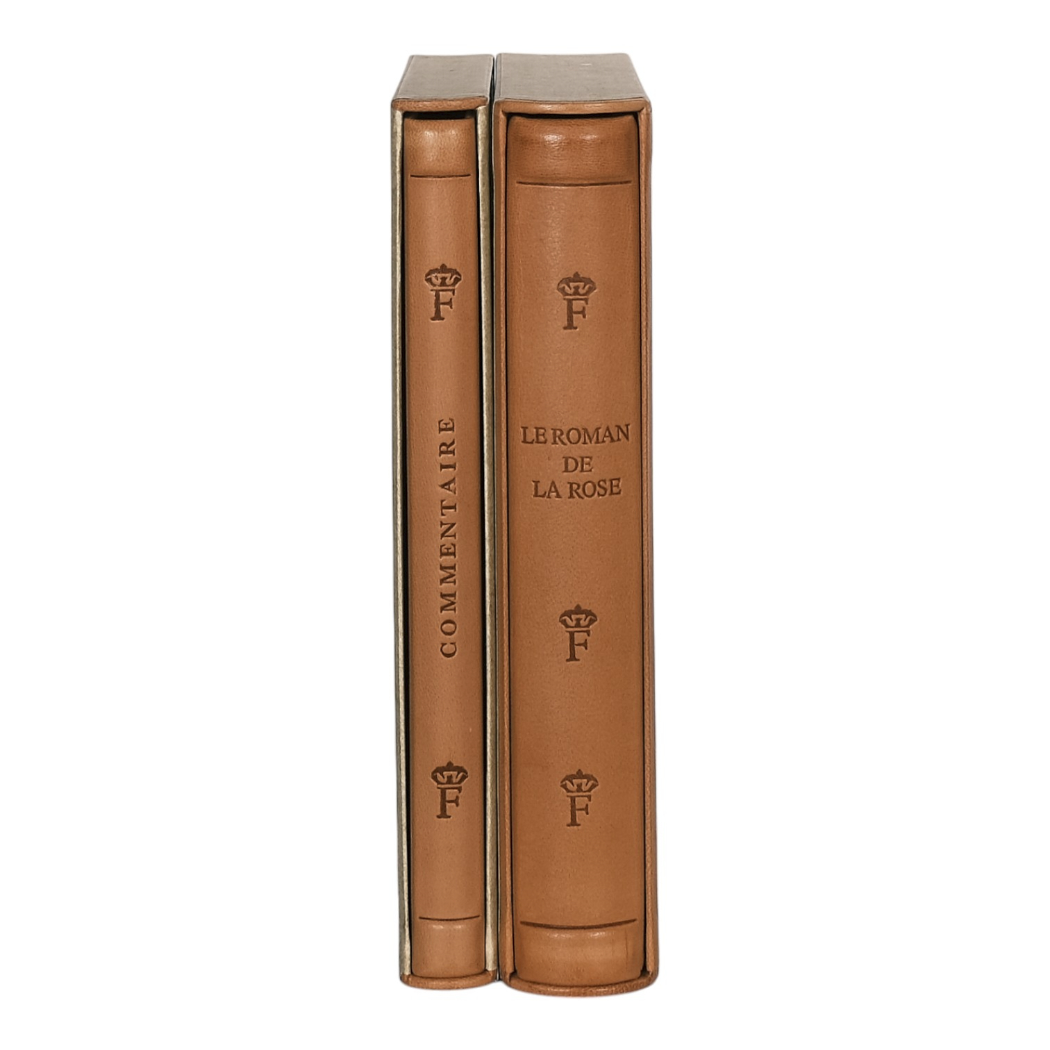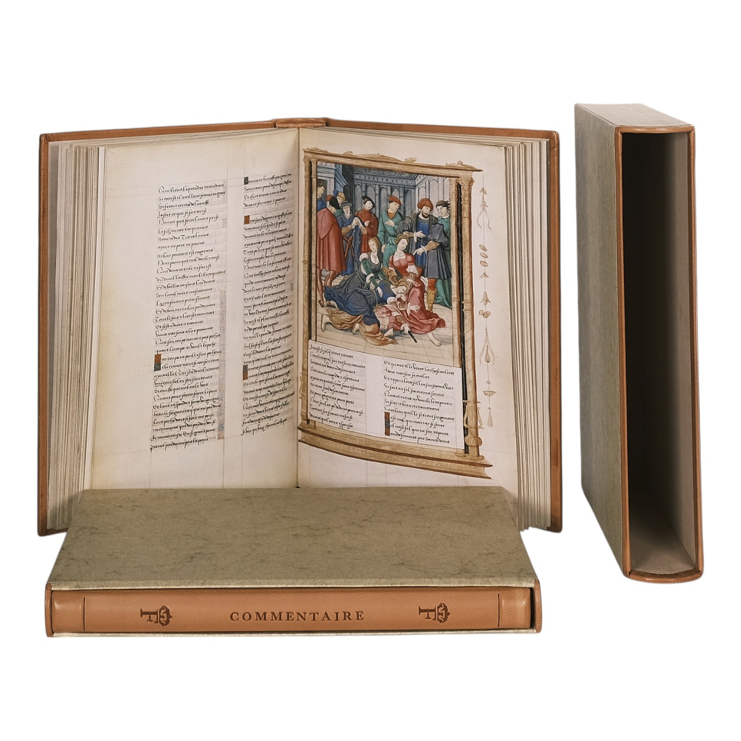 Two volumes in slipcases. Facsimile volume bound in full leather with blind-stamped gilt and decorations, commentary volume bound in half leather. Facsimile reproduces manuscript M.948 from the Pierpont Morgan Library, New York. Commentary includes annotations by Margareta Friesen, translated into French by Sylvie Jacques, and an essay by Georges Duby. Limited edition of 980 numbered copies, this is number 105. Printed by Akademische Druck- u. Verlagsanstalt in Graz (facsimile) and Sallaz in Lyon (commentary), bound by the Centre de Limoges. Text in French. Both volumes in excellent condition, see pictures.
