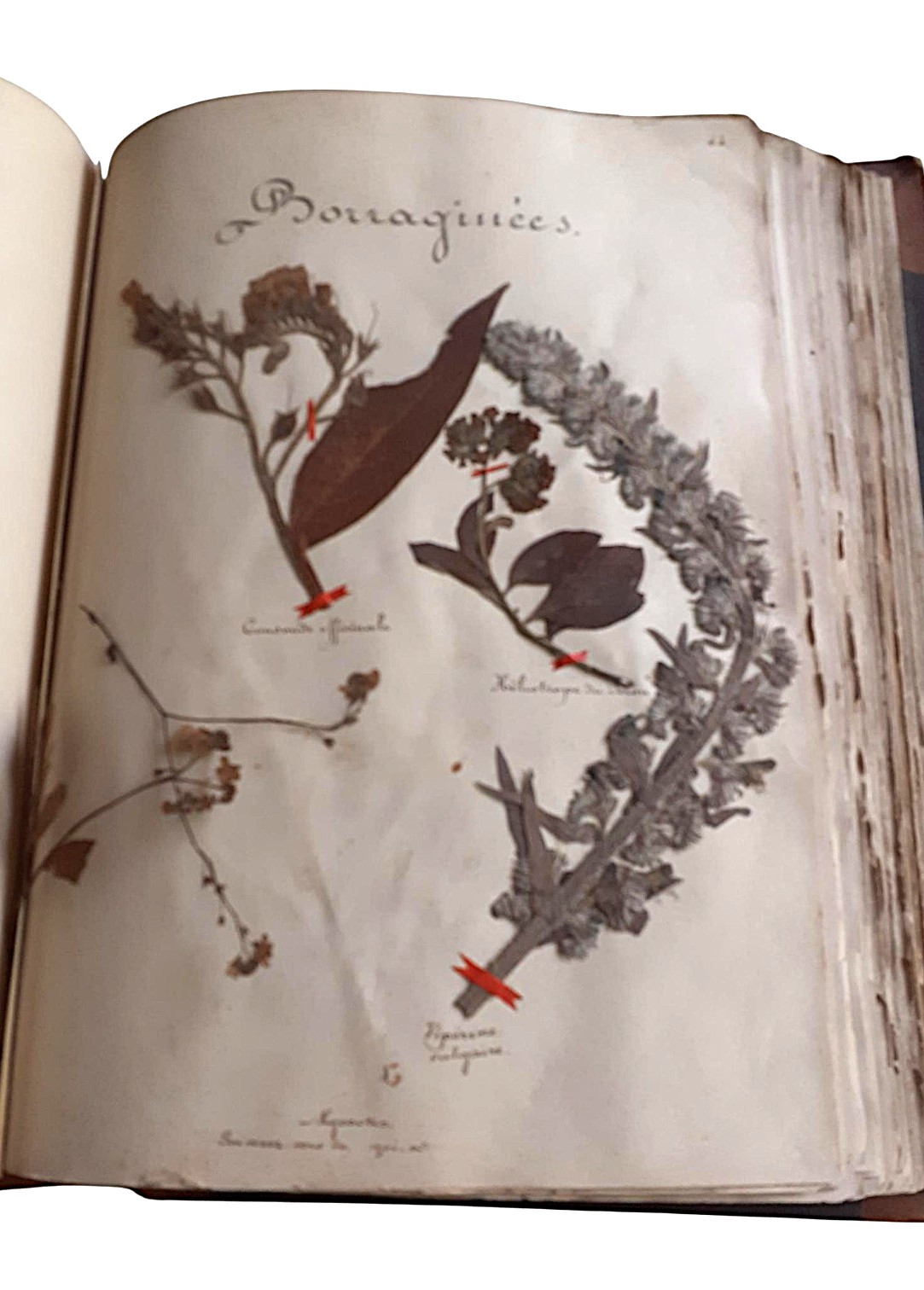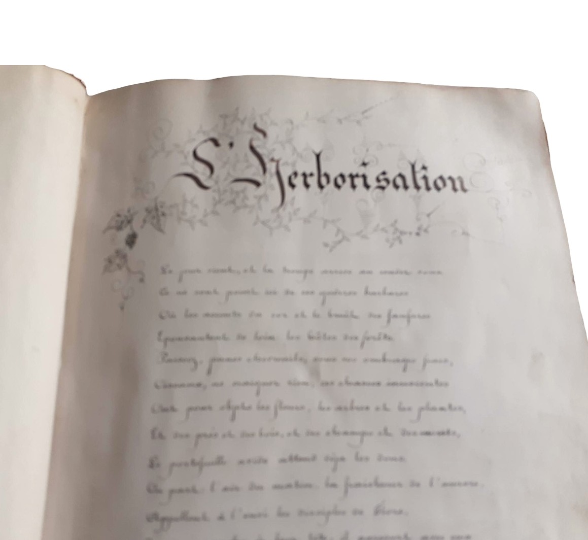 32 x 24 cm, contemporary half-leather binding with percaline boards, original paper label with the compiler?s name on the front board, 135 folios of which 124 contain pressed plants mounted on paper; excellent condition. A well-preserved late-19th-century herbarium compiled by Elise Dejaiffe (1858?1949), daughter of Télesphore Dejaiffe, mayor of Mazy and director of the region?s black-marble quarries. This carefully executed ?hortus siccus? offers a fine example of amateur botanical practice of the period. The specimens are neatly arranged and accompanied by handwritten annotations, including classification notes in French and plant names in Latin. A compelling document of both regional natural history and personal scientific interest.