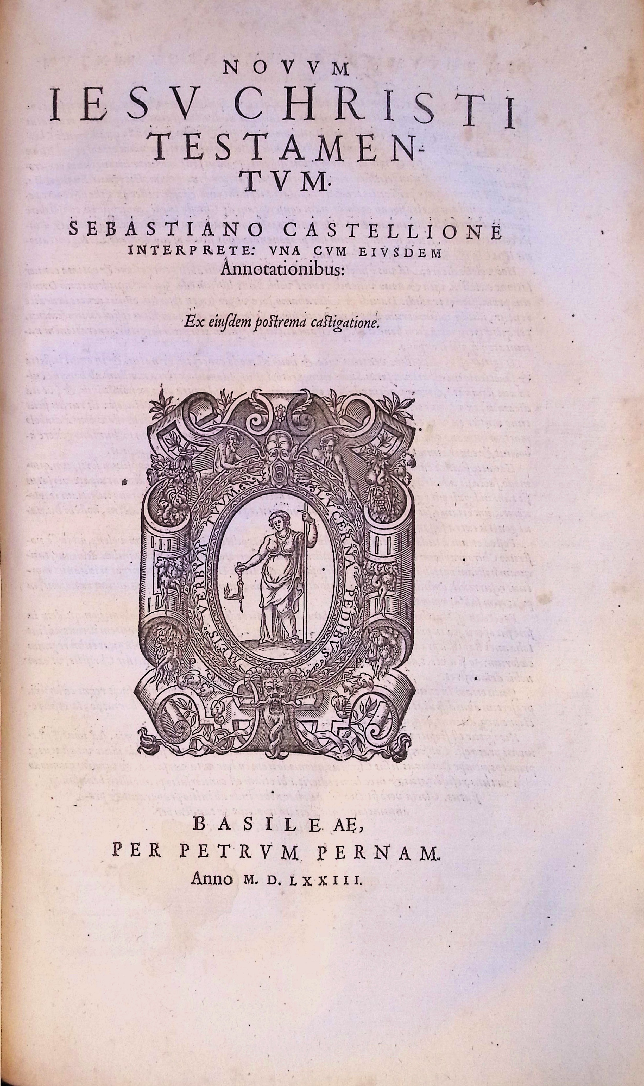 16] pages, 1446 columns, [1] pages, 404 columns, [64] pages : illustrations woodcusts ; 37 cm (Fol.), pigskins, Sebastiani Castalionis Sébastien Châteillon: "The fourth edition of Châteillon's version [previously published 1551, 1554, 1556]. The Bible text is printed in 2 columns per page, and is divided into verses; with prefaces to books, chapter summaries, With some woodcut illustrations