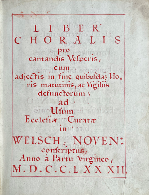 Manuscript- "Liber Choralis pro cantandis Vesperis, cum adjectis in fine quibusdam Horis matutinis, ac Vigiliis defunctorum: ad Usum Ecclesiae Curatae in Welsch-Noven conscriptus". Music manuscipt in Latin in red and black ink, written and signed by Patritius Gassmayr.