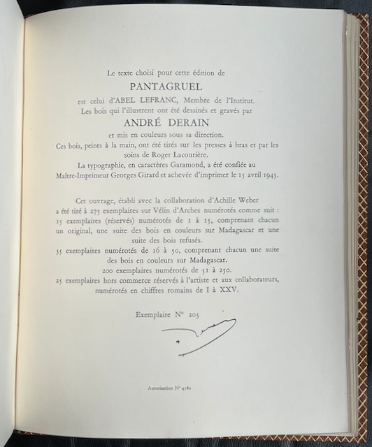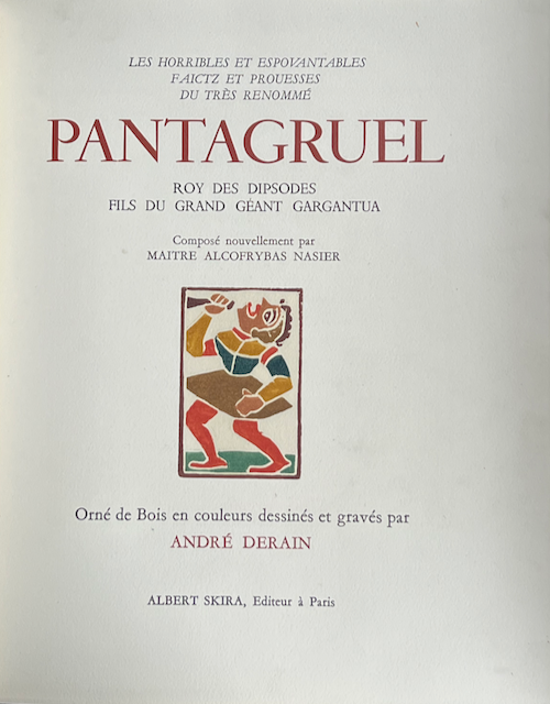 Les horribles et espovantables faictz et prouesses du très renommé Pantagruel, roy des dipsodes, fils du géant Gargantua. Composé nouvellement par Maitre Alcofrybas Nasier. Orné de Bois en couleurs dessinés et gravés par André Derain.