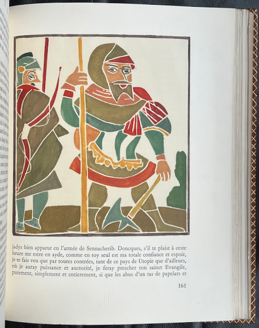 Middle brown crushed morocco binding signed Anthoine Legrain. An ongoing design over the covers and spine of a broad border of fishbone lines at the outer side tooled in gold and on the inner side blindtooled, becoming even broader on the spine. On the covers playfull arranged gold tooled curly R's onlaid with green, turqoise, blue, red, yellow and aubergine morocco. Central on the flat spine the title. Turn ins with a broad gold tooled fishbone pattern border. Double end bands of light- and dark green silk. Dark blue peau de suede pastedowns and first free endleaves, second pair of free endleaves of marbled paper. Edges gilt. With a vellum paper chemise and slipcase. Original wrapper bound in. This is undoubtedly the finest book illustrated by the artist, and one of the most remarkable illustrated books of the 20th century. The original iconography draws on 16th century imagery, from which it borrows both compositional codes and coloring techniques. It took over three years to apply the tints by hand in a kind of "à la poupé" technique to each woodblock, and each copy of the book features slight variations that distinguish it from the others and is thus unique.