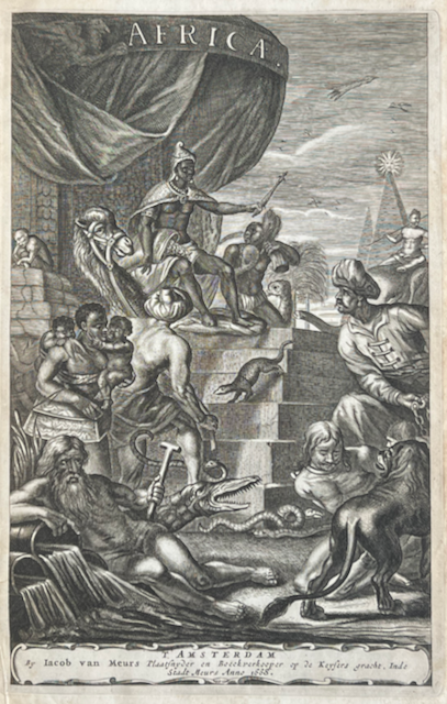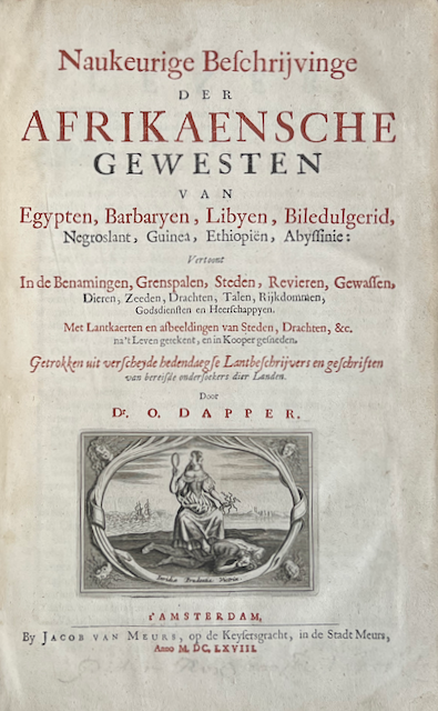 Naukeurige Beschrijvinge der Afrikaensche Gewesten van Egypten, Barbaryen, Libyen, Biledulgerid, Negroslant, Guinea, Ethiopiën, Abyssinie: Vertoont In de Benamingen, Grenspalen, Steden, Revieren, Gewassen, Dieren, Zeeden, Drachten, Talen, Rijkdommen, Godsdiensten en Heerschappyen. Met Lantkaerten en afbeeldingen van Steden, Drachten, &c. na ?t Leven getekent, en in Kooper gesneden. Getrokken uit verscheyde hedendaegse Lantbeschrijvers en geschriften van bereisde ondersoekers dier Landen. [With:] Naukeurige beschrijvinge der Afrikaensche eylanden.