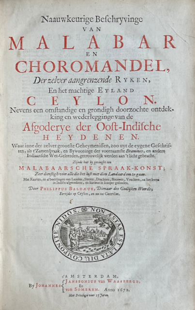 Naauwkeurige beschryvinge van Malabar en Choromandel, Derzelver aangrenzende Ryken, En het machtige Eyland Ceylon. Nevens een omstandige en grondigh doorzochte ontdekking en wederlegginge van de Afgoderye der Oost-Indische Heydenen. Waar inne der zelver grootste Geheymenissen zoo uyt de eygene Geschriften als t?Zamenspraak en Bywooninge der voornaamste Bramines en andere Indiaansche Wet-Geleerden getrouwelijk werden aan ?t licht gebracht. Zijnde hier by gevoeght een Malabaarsche Spraak-konst; Zeer dienstigh voor alle die het lust met dien Landaard om te gaan. Met Kaarten en afbeeldingen van Landen, Steden, Drachten, Boomen, Vruchten, na het leven in Indiën afgeteekent en kurieus in kooper gesneden.