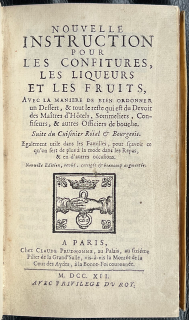 Nouvelle / instruction/ pour/ les confitures, / les liqueurs / et les fruits, / Avec la maniere de bien ordonner/ un Dessert, & tout le reste qui est du Devoir des Maitres d'Hotels, Sommeliers, Confiseurs, & autres Officiers de Bouche. Suite du Cuisinier Roïal & Bourgeois. Egalement utile dans les Familles, pour sçavoir ce qu'on sert de plus a la mode dans les Repas, & en d'autres occasions. Nouvelle édition, revuë, corrigée & beaucoup augmentée.
