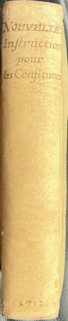 Vellum laced case binding. Later end leaves. Originally published in 1692, the 1712 [here offered], being the 5th edition. the 'Nouvelle Instruction pour les confitures' was intended as a suite to Massialot's famous work 'Nouveau Cuisinier Royal et Bourgeois' [1691]. It is also a separately published book in its own right. The Nouvelle instruction is 'brimming with recipes for liqueurs, eaux-de-vie, esprit de vin, ratafias, distilled botanical waters, and hypocras, this volume is another inspiration for bartenders aspiring to create new ingredients.' [Anistatia Miller]: