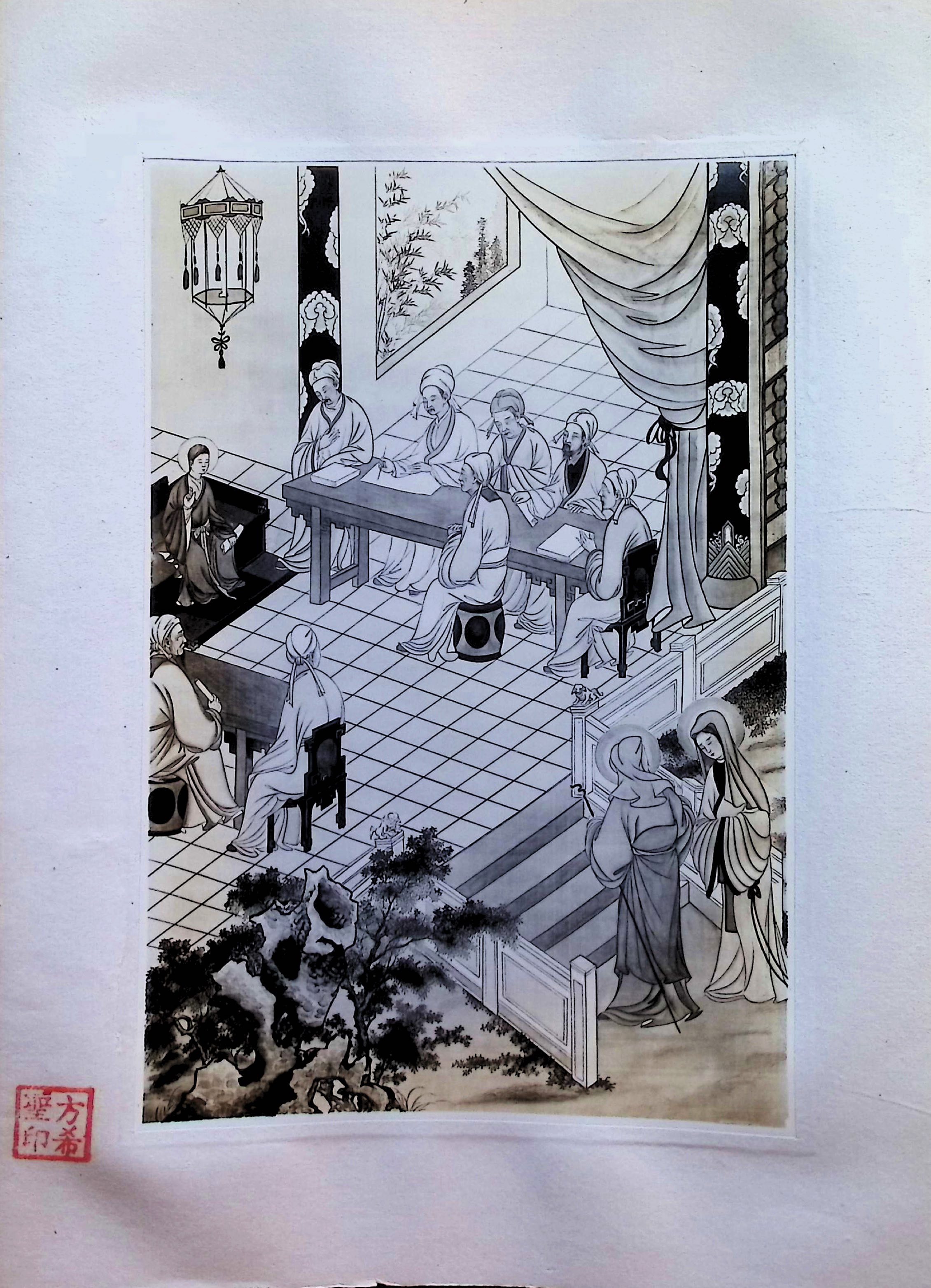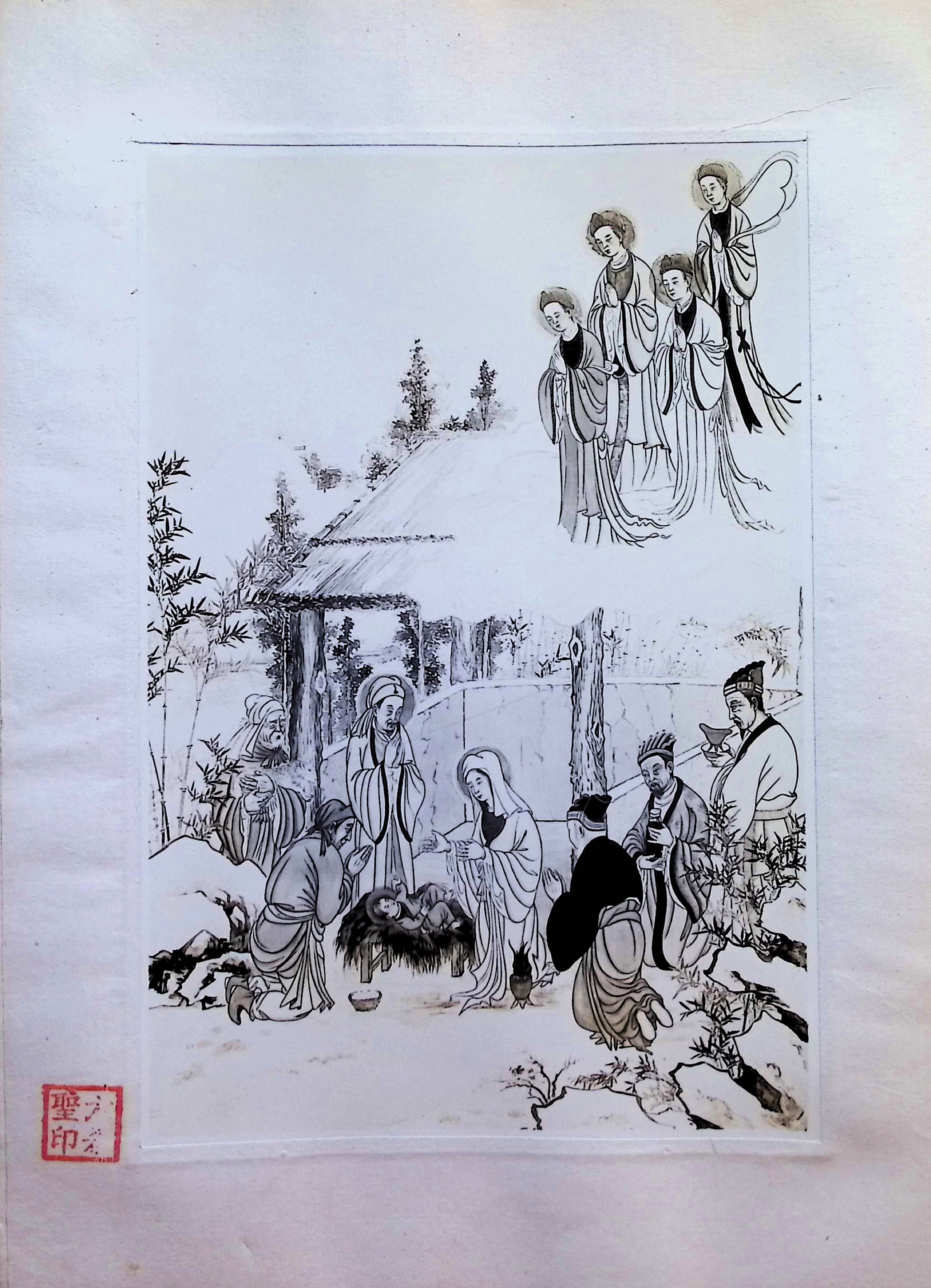 Een geschenk van Missionaris Mon Van Genechten aan Mgr. Morel, Bisschop Van Sui-Yuan. Gedateerd 2 januari 1940. Het boek bevat 8 scenes uit de bijbelse geschiedenis. 27 x 19 cm, op chinese wijze gebonden, twee houten platten. De bijbelse scenes zijn foto's van de werken van Mon Van Genechten, 20 x. 15cm. Al de foto's en de boodschap aan Mgr. Morel zijn gestempeld met zijn chinese naamstempel in rode inkt, Fang Xisheng. Een uniek document .