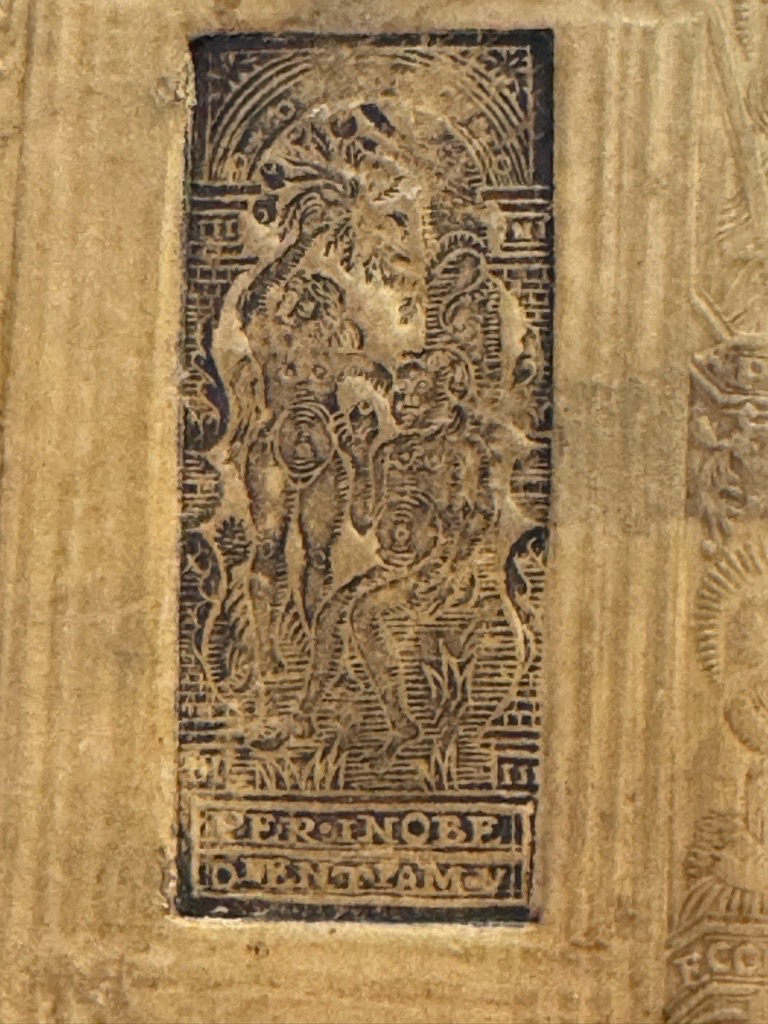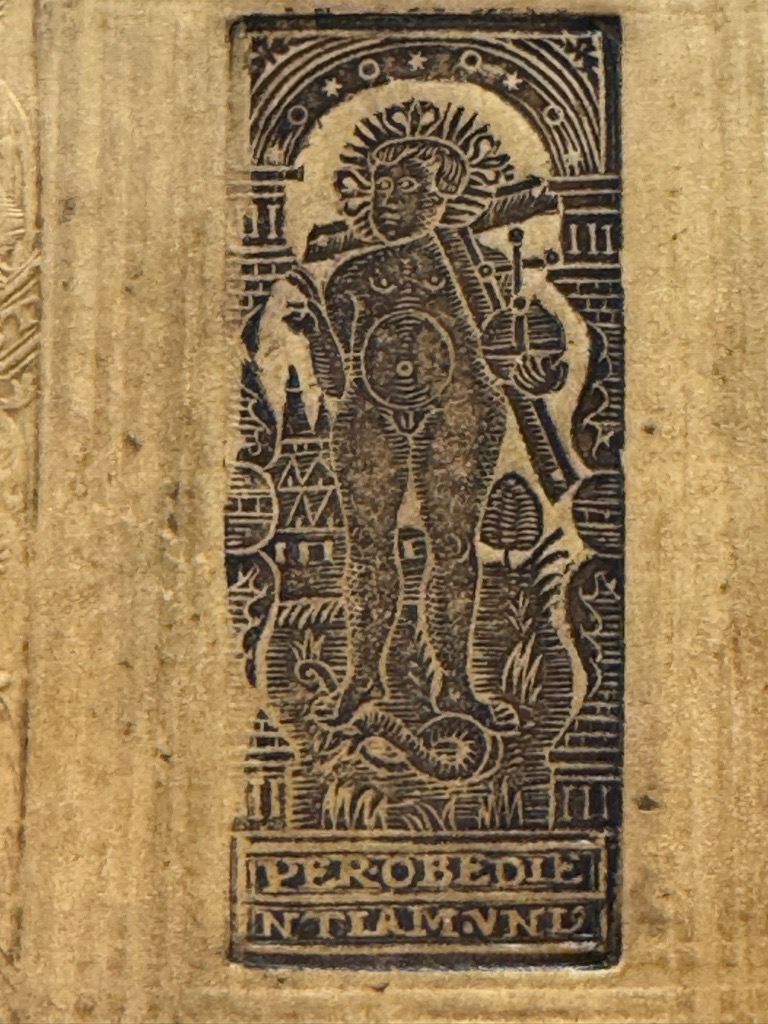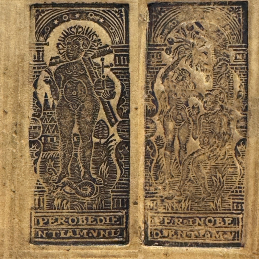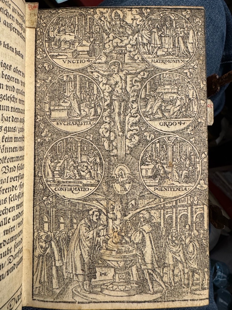 VD16 B 8320; De Backer-S. II, 184, 5; NDB II, 614.; Hartzheim, Bibl. Col. S. 276 f.; Merlo, Sp. 1119f.; Äußerst seltener katholischer Katechismus aus der Feder des Jesuiten Brillmacher aus der Mitte der Auseinandersetzung zwischen Reformation und sogenannter "Katholischer Reform" bei dem der Autor vehement die Positionen des Tridentinums vertritt und sich gegen die des Luthertum und Calivnismus positioniert.( vgl hierzu W. Schmitz, Die überlieferung deutscher Texte im Kölner Buchdruck des 15. und 16. Jahrhunderts, S. 138 ff.(Kapitel Katechismen)). Peter Michael Brillmacher (* 1542 in Köln; ? 25. August 1595 in Mainz) der sich als Autor Petrus Michaelis nannte veröffentlichte zahlr. Gebetbücher, Katechismen und Kontroversschriften die das Ergebnis seiner ausgiebigen und erfolgreichen Seelsorgs- und Predigt-Tätigkeit waren. Peter Michael Brillmacher wurde in Köln 1542 als Sohn Marcus Michaels, genannt Brillmacher, geboren. Peter Brillmacher trat im Jahr 1558 in den Jesuitenorden ein, im folgenden Jahr verlieh die Universität Köln ihm das Baccalauréat und ein weiteres Jahr später wurde er Magister artium. 1561 trat er dem Kolleg in Trier bei. 1566 oder 1567 wurde er zum Priester geweiht; im Jahr 1567 hielt er seine Primiz in Mainz. An der dortigen Universität erlernte er die griechische sowie die hebräische Sprache. Anschließend betätigte er sich als Prediger. Die orientalischen Sprachen studierte er dann seit Mai 1567 an der Universität von Paris, kehrte 1568 als Prediger nach Mainz zurück, wo er fortan Hebräisch unterrichtete. Ab Herbst 1569 predigte er im Speyerer Dom. Nachdem er 1570 Vizerektor am Jesuitenkolleg Speyer geworden war, rückte er 1571, als Nachfolger von Hermes Halpaur, zum Rektor auf und verließ das Kolleg 1579. Anschließend predigte er in Köln, wurde 1585 als Prediger und Berater des Herzogs von Jülich-Kleve-Berg in Kleve und Düsseldorf und verfasste und veröffentlichte in dieser Zeit den vorliegenden Catechismus. Er musste diese Stelle jedoch nach gut zwei Jahren Aufgrund einer HofIintrige aufgeben. Anschließend ist er erneut als Prediger in Köln nachweisbar. Dort kam es zu einem Streit mit Stephan Isaac, der vom Judentum zum Calvinismus übergetreten war. 1588 kam er als Rektor zum Jesuitenkolleg Münster. Zugleich war er damit auch Schulleiter am Gymnasium Paulinum. Beide Stellen hielt er bis zu seinem Tode am 25. August 1595 in Mainz inne. vgl. E. Iserlohn, ´Peter Michael Brillmacher´ in NDB ebd. Der wiederholte Holzschnitt zu Beginn und ende des Buches zeigt das Wappen der Herzöge zu Jülich, Cleve u. Berg dar, denen die Schrift gewidmet ist. Die übrigen rund drei Dutzend Holzschnitte sind überwiegend monogrammiert mit "H E", Merlo schreibt dazu "Der Xylograph mit den Monogrammen ist ein geschickter Künstler aus der zweiten Häöfte des 16. Jahrhunderts, der seine Arbeiten mit goßer Zartheit ausführte: (...) Bartsch (" Peintre-Graveur" IX, , HE) beschreibt 3 Blätter auf welchem er die Monogramme fand." Merlo weist auf mehrere Werke aus dem Hause Calenius/ Quentel hin, was wohl auf die übliche, mehrfache Verwendung der Holzschnitte hindeutet, in diesem Band finden sich jedoch die mit den meisten Motive des HE. Abgebildet sind eine ganzseitige Darstellung der Sieben Sakramente, Maria und Christus, eine Kreuzigungsgruppe und weitere biblisch/religiöese Szenen.- Auf dem Titelblatt findet sich der handschriftliche Besitzvermerk "Ex libris Jacobi Synnoth Haganoensis [i.e. Hagneau/Elsass] Anno Domini 1596. Der prächtige Pergamenteinband über Holzdeckeln zeigt mit auf den Deckeln zwei markant dunkel eingefärbte Platten mit der klasssisch lutheranischen Motiven aus Römer 5,19. "per obedientiam uni/ per inobedientiam u... ~ durch den Gehorsam eines Menschen (Jesus Christus) viele Menschen als Gerechte vor Gott stehen, so wie durch den Ungehorsam eines anderen Menschen (Adam) viele als Sünder dastehen... Es geht um eine Gegenüberstellung von Christus Salvator (also Heiland/Erlöser) (auch erkennbar an der Weltkugel mit dem Kreuz) und Sündenfall (Adam und Eva) nicht bei Haebler.. Die Rollenstempel zeigen die klassischen Motive "Data est = Christus Salvator", "Tu es = Petrus" und "Ecce Agn.. Johannes der Täufer als Umrahmung auf beiden Deckeln wiederholt.