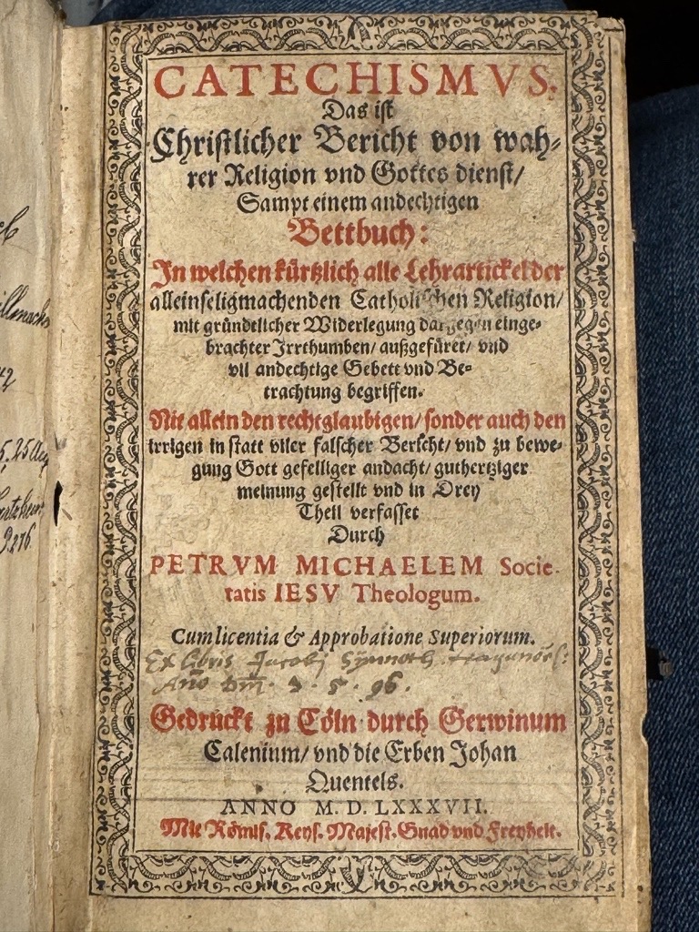 Catechismus das ist christlicher Bericht von wahrer Religion und Gottes-dienst, sampt einem andechtigen Bettbuch, in welchem kürtzlich alle Lehrartickel der alleinseligmachenden Catholischen Religion ... außgefüret und vil andechtige Gebett und Betrachtung begriffen in drey Theil verfasset durch Petrum Michaelem.