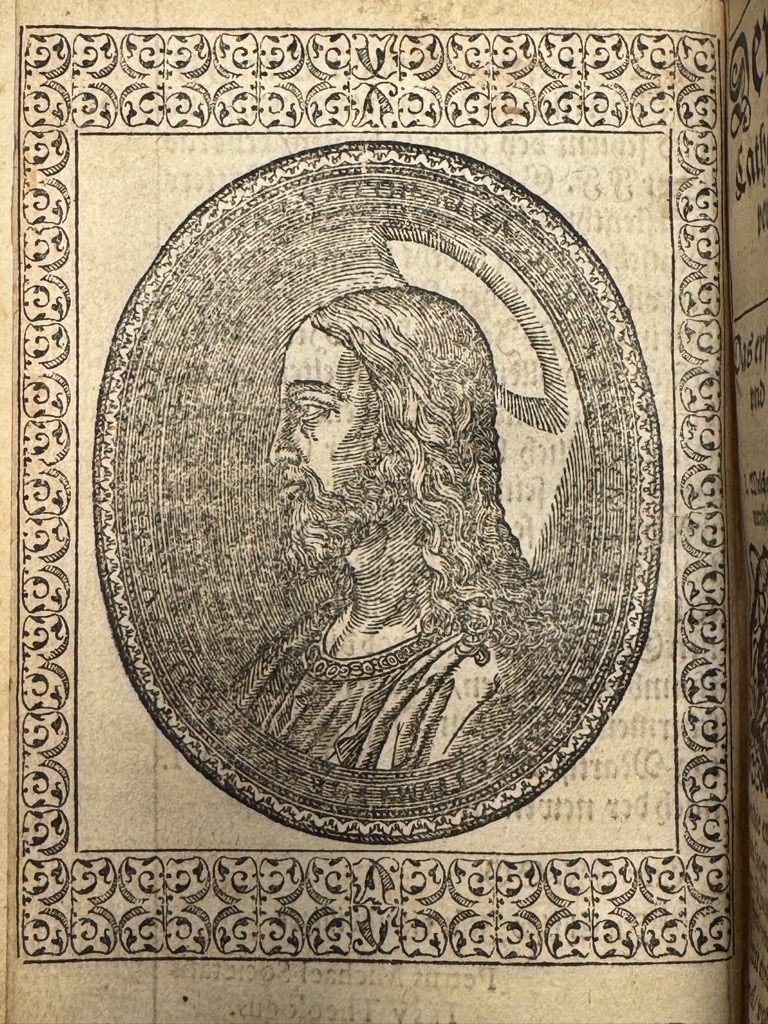 Cölln, Verlag, Calenium u. Quentel, 1587. [8] Bl., 670 S., [9] Bl.mit zwei ganzseitigen (wiederh.) Wappenholzschnitten (Kleve Jülich Berg), ebs. seitliches Porträt Christus und einigen Holzschnitten biblischer Themen im Text.