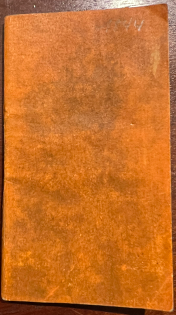 Flexible orange paper. Sewn. Unrecorded year for this series. The calendar covers the first half of the almanac. The other part contains accounts of historical events, witty stories, songs and poems, i.a. a poem: "De lof van het café drinken".