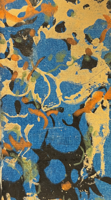 Light brown calf. On the covers a border of 2 delicate rolls. Flat spine divided in 6 compartments with various centre tools and a red and green label. Board edges and turn ins with a decorative roll. Very colourfull marbled end leaves. Green place marker. Edges gilt. Very rare copy printed on purple paper, not mentioned by Grand Carteret. After the calendar and practical information part. The songbook starts on page 17