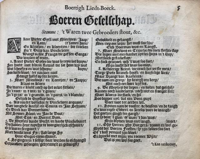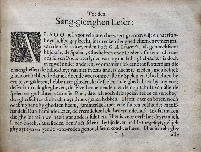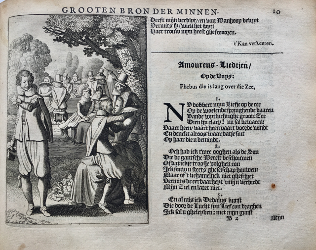 Boertigh, amoreus, en aendachtigh Groot Lied-Boeck. Verçierd met vele klinckers, oock bruyds-lof en klaeg-Dichten. Door-mengeld met sin-rijcke beeltenissen. Alles tot vermaeck en nut der ieughet, sampt allen lievers der rijm-konst. 3 parts in 1 vol.: I. Boertigh liedt-boeck. II. De Groote Bron der Minnen. III. Aendachtig Liedt-Boeck.