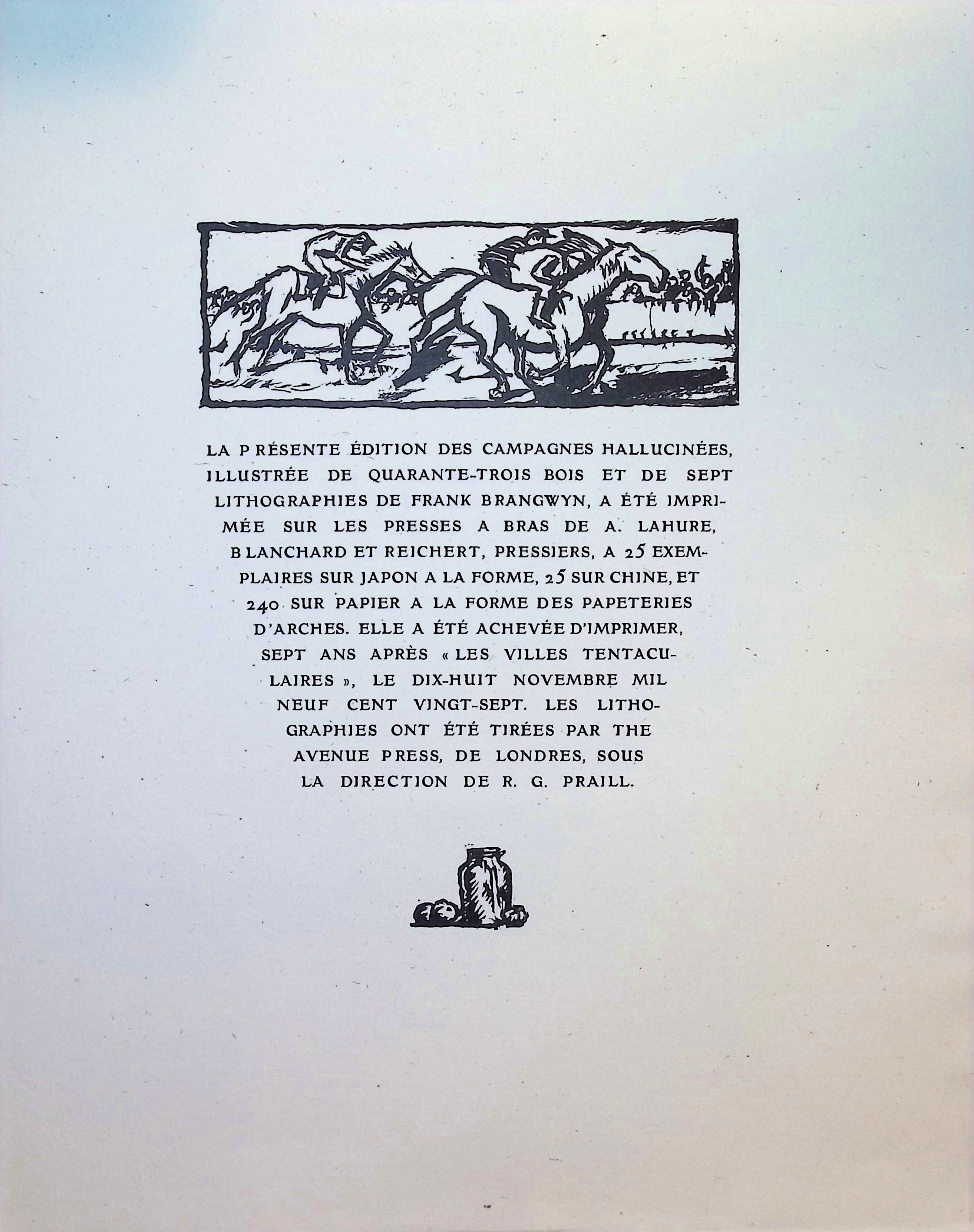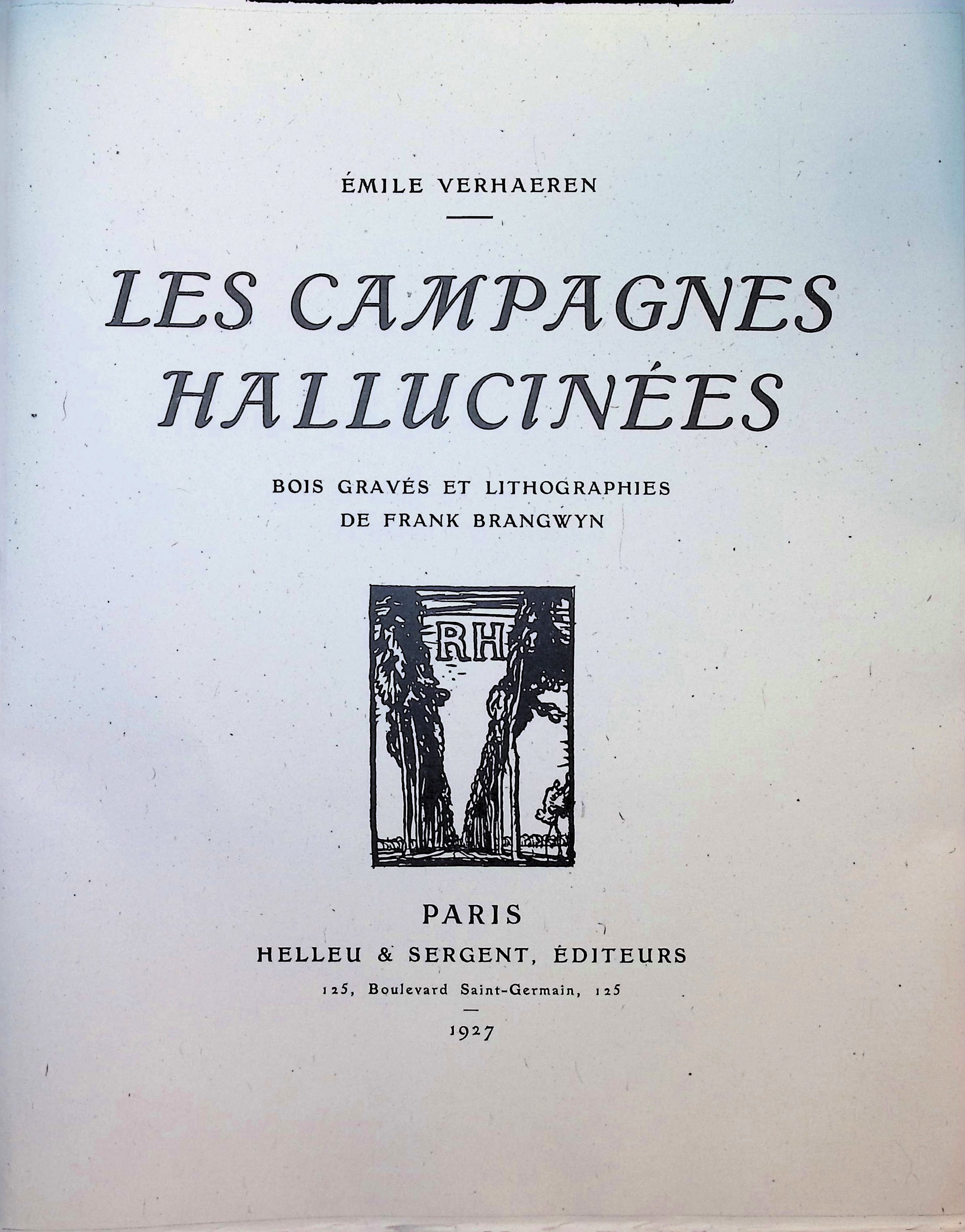 Emile Verhaeren, Paris, Helleu & Sergent, 1927. In-4, Première édition illustrée. Elle a été ornée par Frank Brangwyn de 43 bois gravés, dont 5 à pleine page, et de 7 lithographies originales hors texte, qui furent tirées à Londres par The Avenue Press. Broché, sous etui, Tirage à 290 exemplaires, celui-ci un des 25 sur chine numérotés n 30 HC, avec les illustrations en double état, le second imprimé hors texte, également sur chine