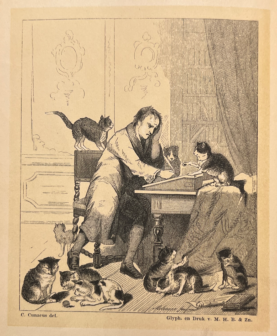 With an engraved frontispice showing the author at his desk surrounded by cats.