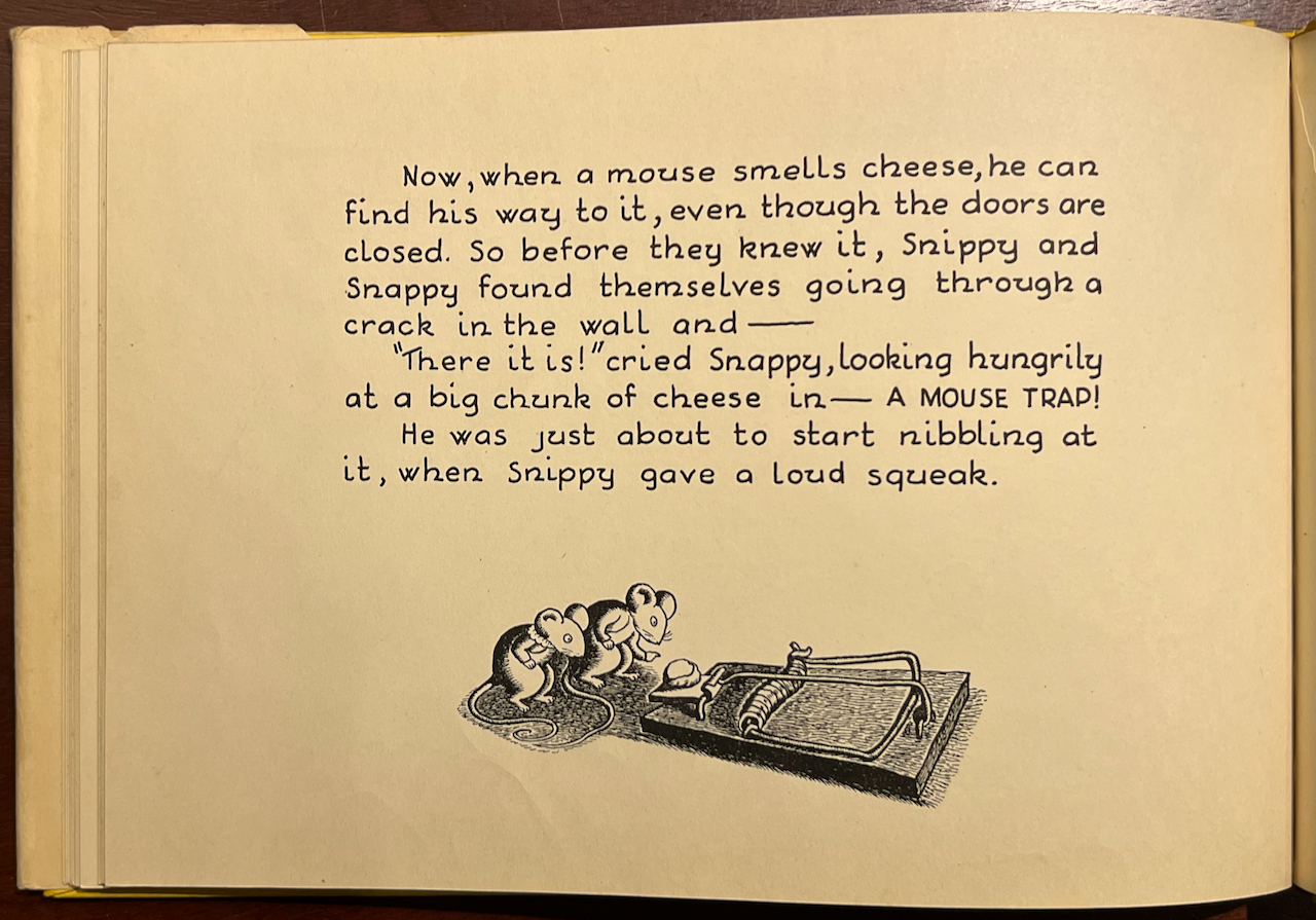 Snippy and Snappy is a children's book about how two little field mice, ventured forth one day in search of cheese, and were rescued by their father just as they were about to investigate a mouse trap. Wanda Hazel Gág (1893 1946) was the eldest daughter of a pair of German immigrant artists, and "was one of the great pioneering printmakers and illustrators of the first half of the twentieth century" (Philadelphia Museum of Art). She is most noted for writing and illustrating the children's book Millions of Cats which won a Newbery Honor Award and the Lewis Carroll Shelf Award. It is the oldest American picture book still in print. Snippy and Snappy was her third children's book.