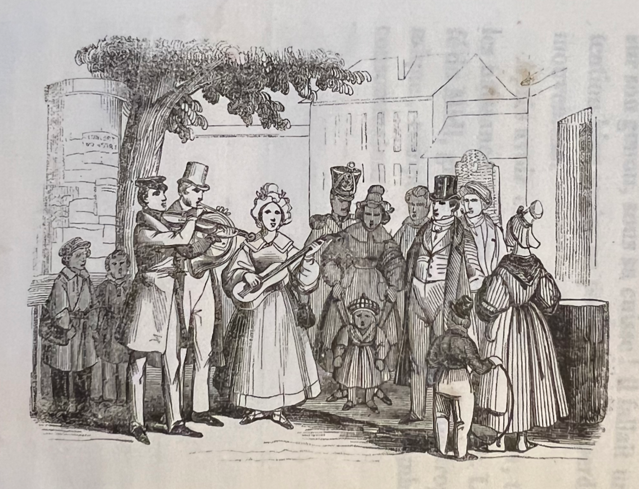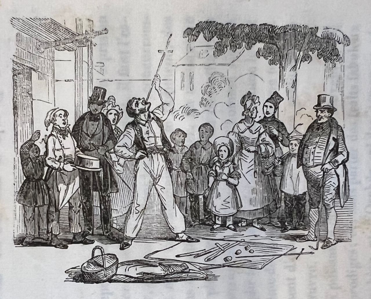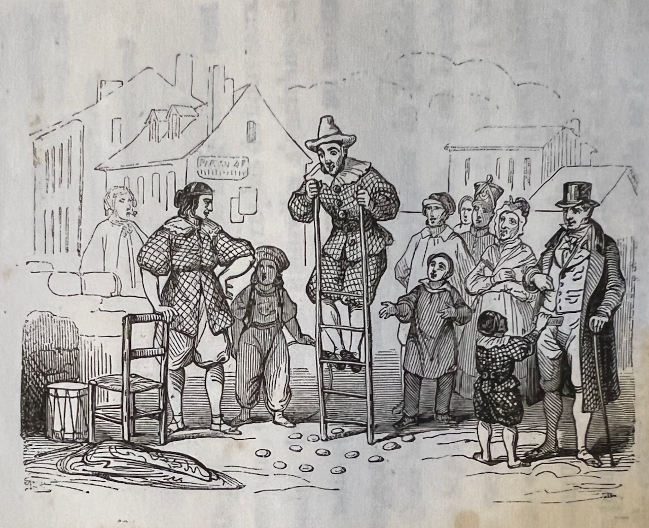 BnF suggests as possible author Gautier. The plates depict street scenes of: Polchinelle, Diseur de bonne aventure, Paillasse, Menagerie, Jongleurs, Chanteurs et Musiciens, Optique, l?Escamoteur, Charlatans and Savoyards.