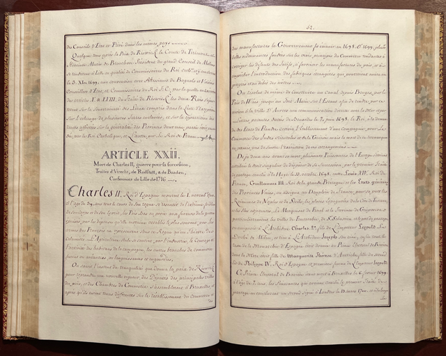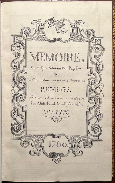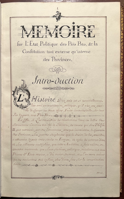 "Me?moire, Sur L? Etat Politique des Pay?s Bas & la Constitution tant externe qu?interne des Provinces, Pour servir a? L?Instruction particuliere de Son Altesse Roiale Mons.r l?Archi-Duc Joseph." Expertly calligraphed manuscript in brown ink in French current script. Decorations, titles and initials in black ink.