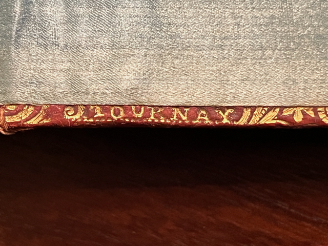 Red morocco, gold tooled. On the covers a rich lacework border of curly tools, flowers and birds. Spine with 6 raised bands, black title label in compartment 2 and in the other compartments a fleuron with corner tools and stars. Boardedges and turn ins with a vegetal roll. End leaves of light blue silk. End bands of blue and white silk. Blue ribbon marker. Edges gilt over marbling. (Signed on turn ins: "DEFLINNE TOURNAY").
