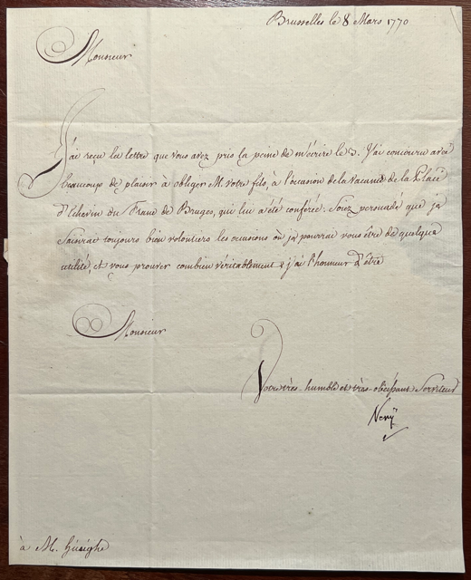 Enriched with a letter from «Neny» to "Monsieur Huughe, Echevin de la Chatellenie d?Ypres". Brussels, 8 March 1770. Bifolium, 1 p., on paper, in French, with red wax seal.