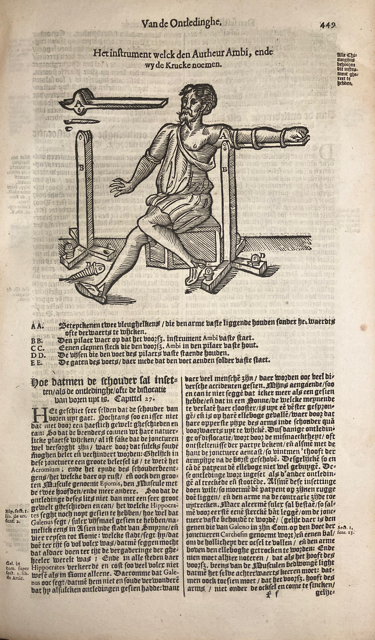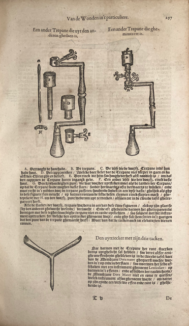 This is the 5th Dutch edition of the collected works. [Preceded by the 1592, 1604, 1615, 1627]. In fact a page for page reprint of the 1604 edition. Issued with it, is Jean Fernel's' Beschrijvinghe der Deelen, which appears only together with the 1636 edition. This tranlation is based on the 4th French edition, wich was the last by the author himself.