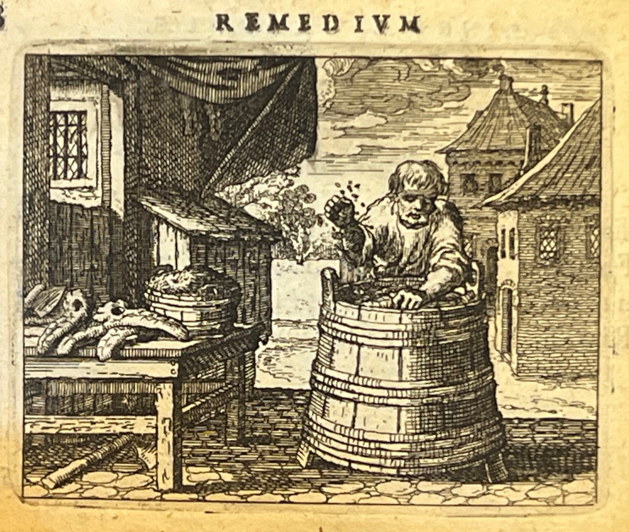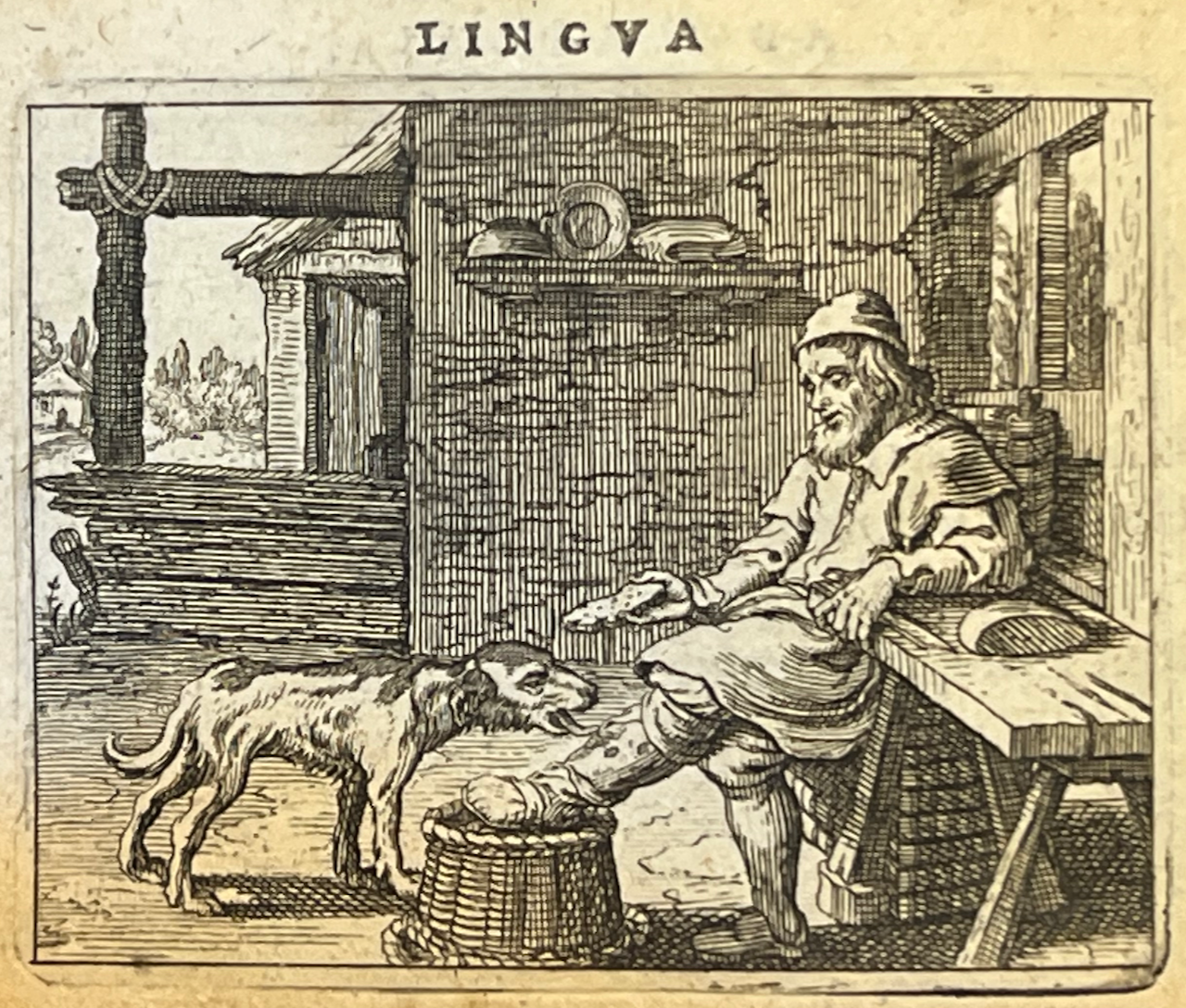 A richly ilustrated pocket emblem book, of which the first Latin and Dutch (Ghebreken der Tonghe) versions were published in 1631. This is a second printing, not a title issue. The first part deals with the sins and shortcomings of speech, the second with the ways to remedy them. Fittingly, the frontispiece shows the entrance to hell.