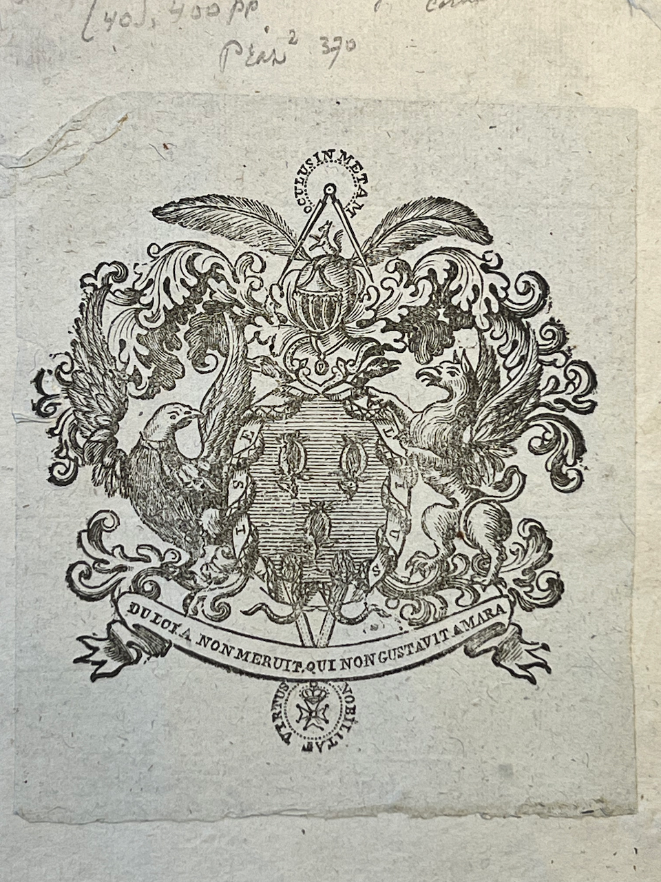 1) Big engraved armorial ex libris of the poet and statesman Samuel Iperss. Wiselius (1769-1845) on upper paste down with the motto: ?Dulcia non meruit qui non gustavit amora?, ?Wiselius?. His library was sold at auction in Amsterdam in 1845, the Hofferus was item 515.