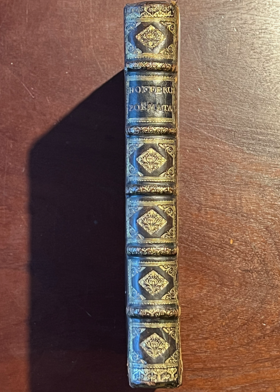18th century sprinkled calf. Richly gilt spine with 5 raised bands. Board edges with a decorative roll. Motled edges. Rare only edition. With this ambitious collection of poems the author followed in the footsteps of Daniel Heinsius, famed professor of the Leyden University, who in 1616 published a book of poems with the same title. In the preface Hofferus presents poetry as a useful tool for the education of christian citizens. Many of his poems have Latin motto?s with a translation in Dutch.