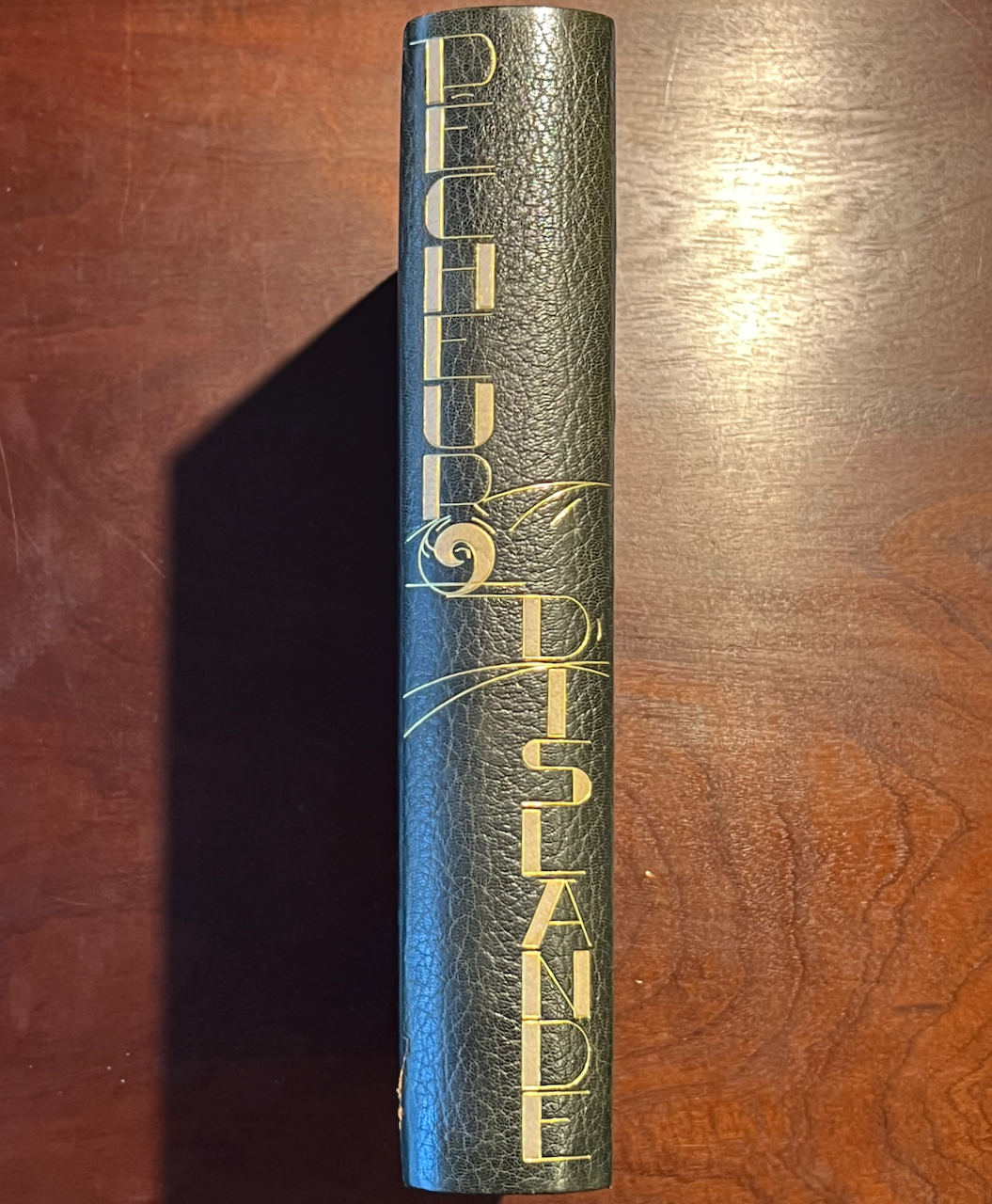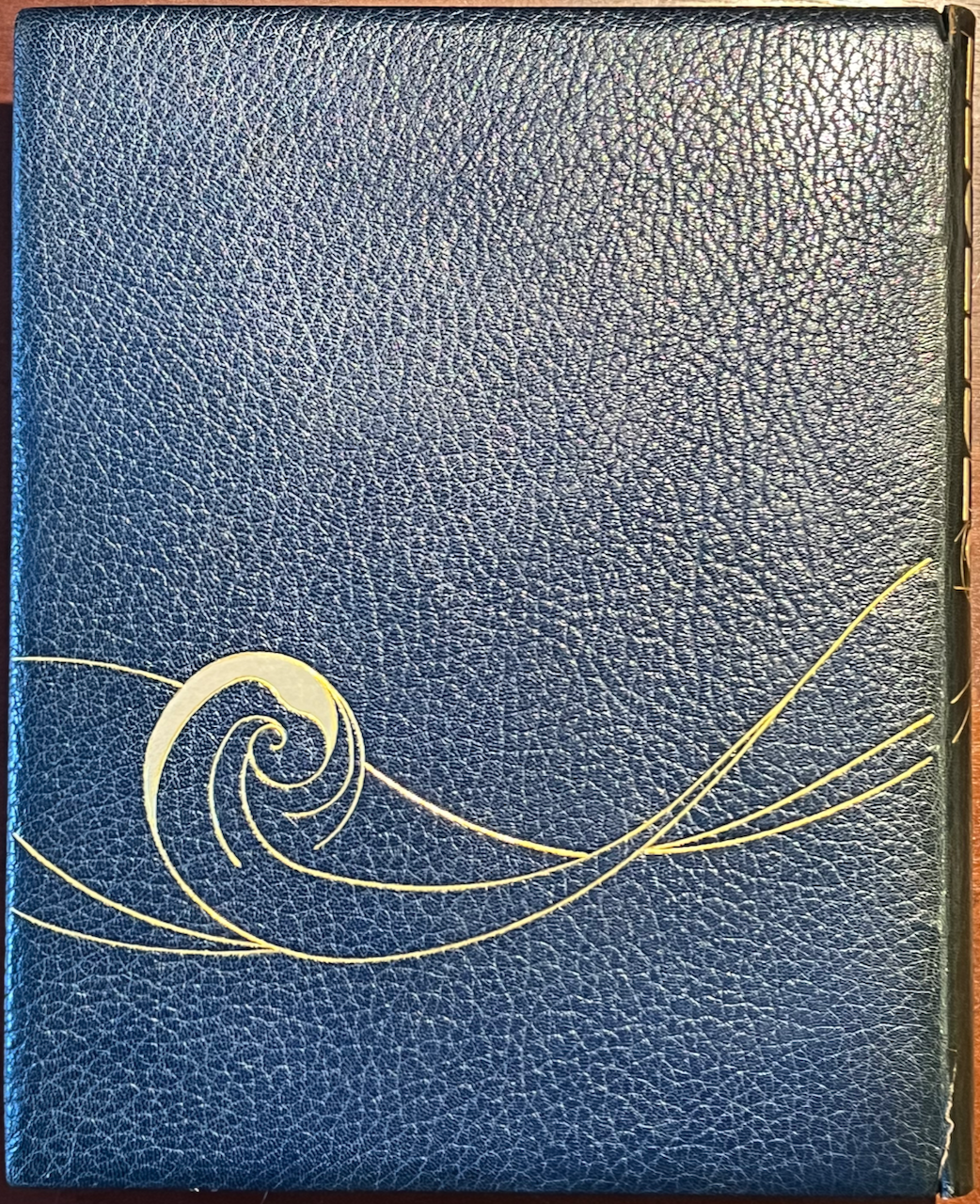 Dark blue crushed morocco, flat spine.. An ongoing design in gold tooling over the spine and both covers, of a stormy sea with onlaid ivory leather waves. On the front cover a large ship with three masts in a dramatic scene. The title vertical on the spine in ivory leather onlays. Doublures of blue watered silk in a gold tooled broad frame of blue and ivory morocco. First free end leaves of the same watered silk followed by marbled end leaves. Yellow and blue silk endbands. Edges gilt. Original wrapper bound in. In matching slipcase. (Signed in gold on upper turn in: "r. laurent rel."). Issued in 150 copies on Vélin d'Arches, this is no. 63 printed for Ge?ne?ral Jacques Willems. With an extra plate as frontispiece. in 2 states, one in colour on Japon, signed in pencil by Lucien Simon, one on arches in grey. This copy with an extra suite in grey on Arches in the first state. Bound up at the end is the rare 2 page prospectus with a manuscript note about the edition and signed by Miguet.