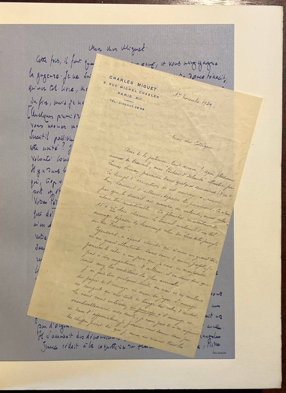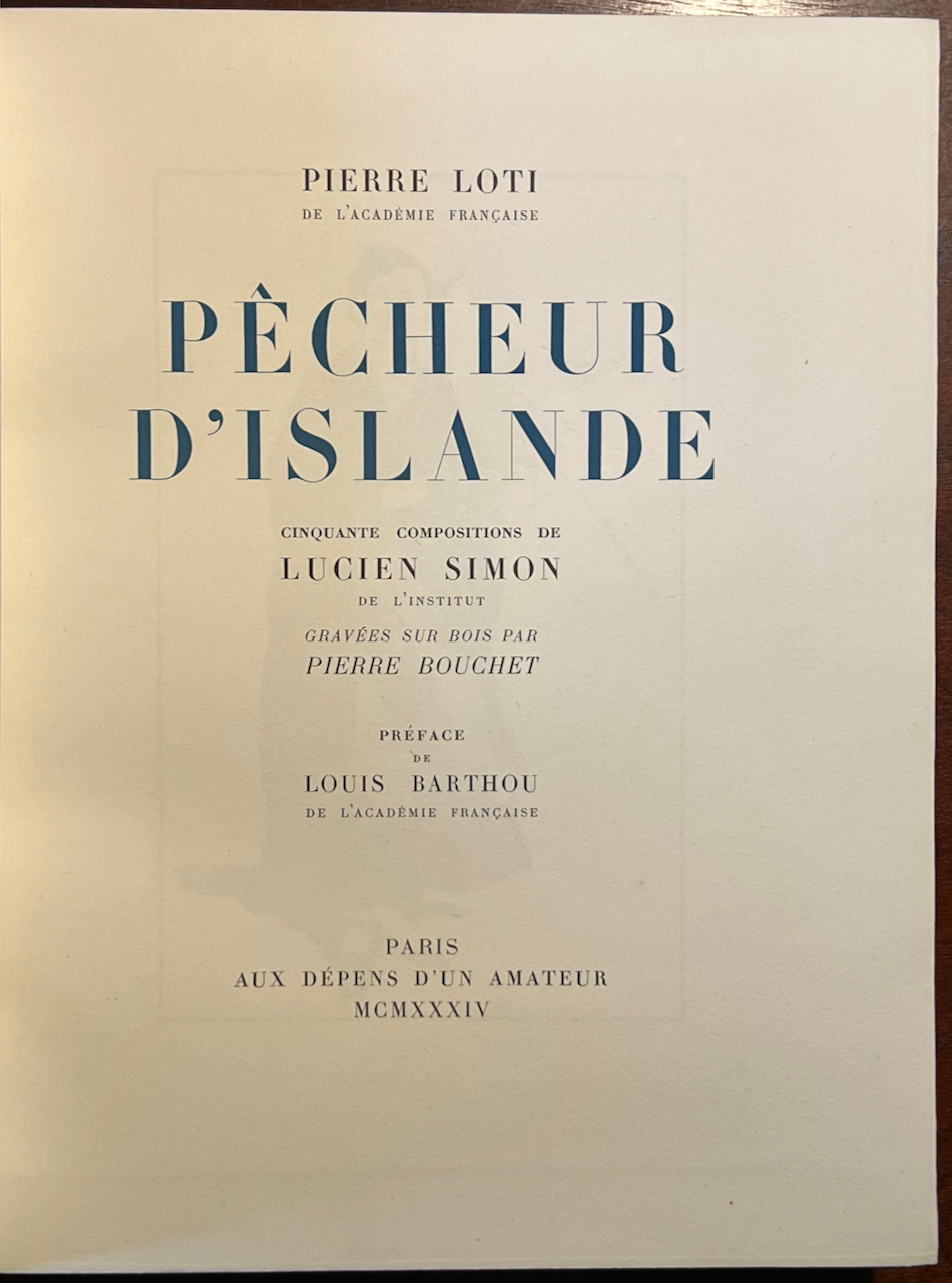 Added is als an autograph letter by Miguet to "Mon chèr collegue" (= Général Willems?) Paris, 1-11-1934, 2 p. in-8° with the printed address of Miguet. He gives many informations about this publication: «Avec de la patience, tout arrive ! Apre?s plusieurs anne?es de travail, mon «Pe?cheur d?Islande» illustre? par Lucien Simon parai?tra dans quelques semaines» (The "acheve? d?imprimer" is dated 30-11-1934) and he tells about the letter of Barthou which he recaived «moins de 24 heures avant son de?ce?s»