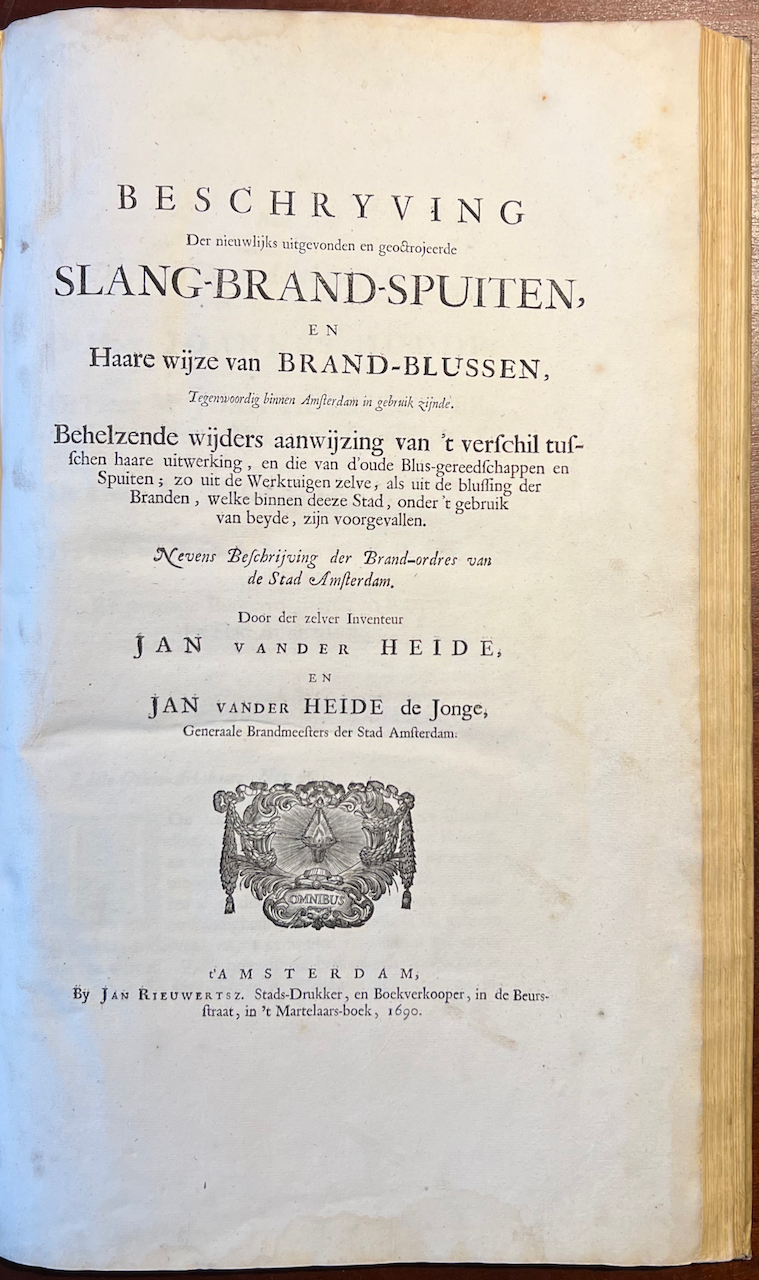 Vellum laced case binding. This book, describing the effectiveness of a new type of fire extinguishing apparatus, using hoses, is in fact an advertisement for its inventors, Jan van der Heide Sr and Jr, who managed to sew together pieces of leather strips in such a way that they became applicable for both suction and delivery. This way the engines could be supplied with water continuously and the stream could be more readily directed at the fire.