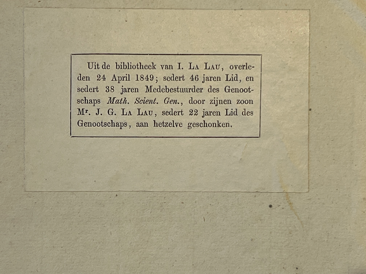 -Provenance: Printed label on upper paste down: I. de La Lau (-1849), given after his death to genootschap Math. Scient. Gen.