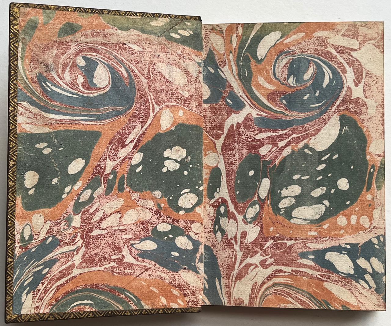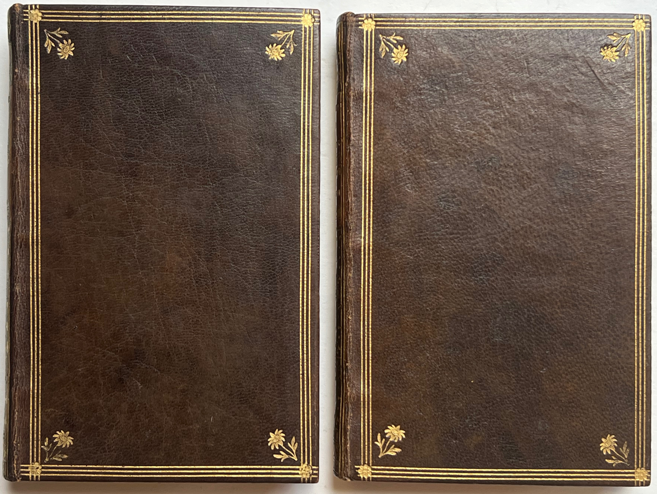 Dark brown morocco, gold tooled. On the covers a triple fillet border with fleurons in the corners. Flat spine with red title label and fleurons. Board edges and turn ins with decorative roll. Marbled end leaves. Edges gilt.